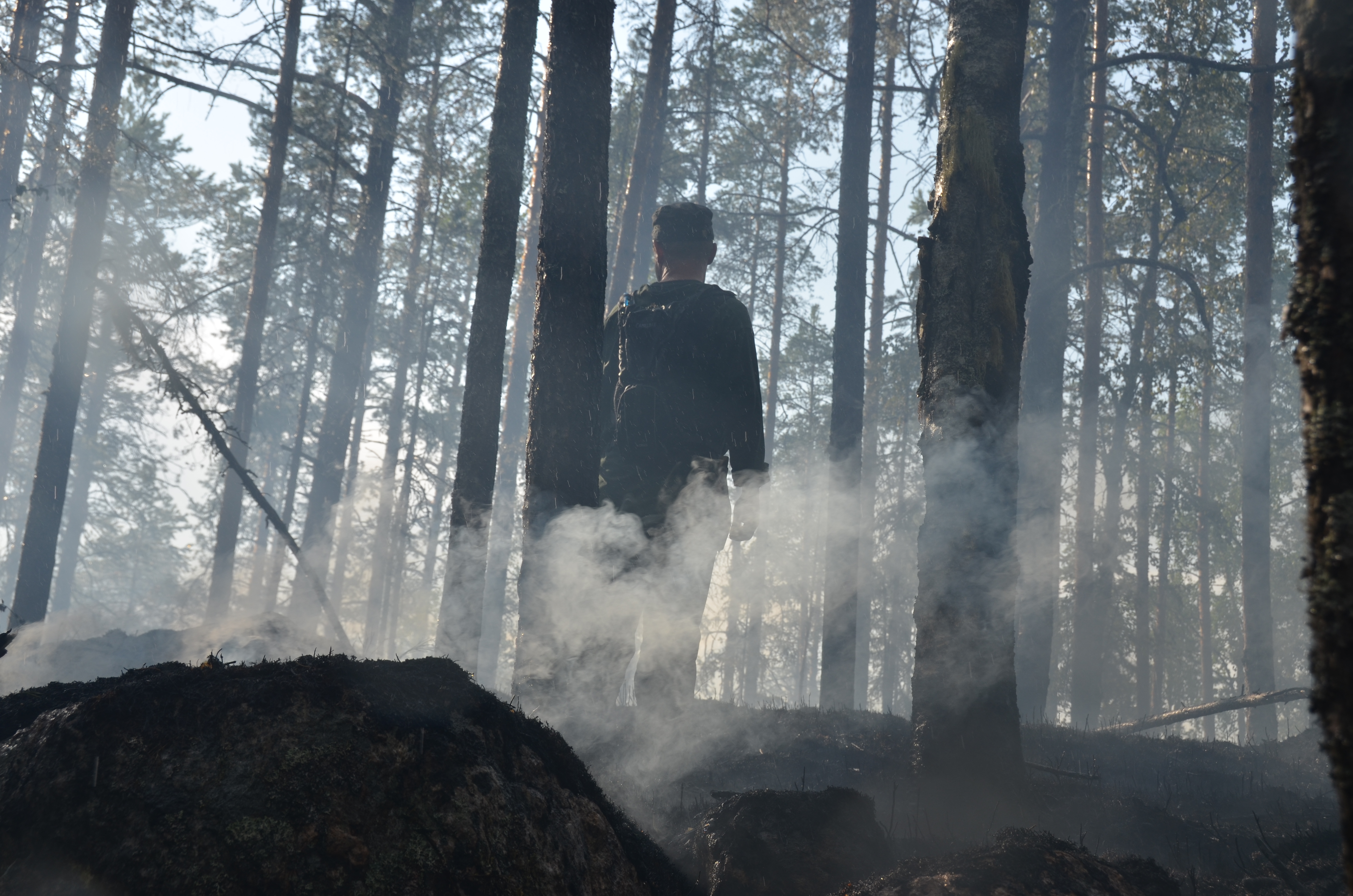 - Beskrivning: Man som står i röken efter en kontrollerad naturvårdsbränning, bränning i Ekopark Ejheden i Rättviks kommun, avbruten