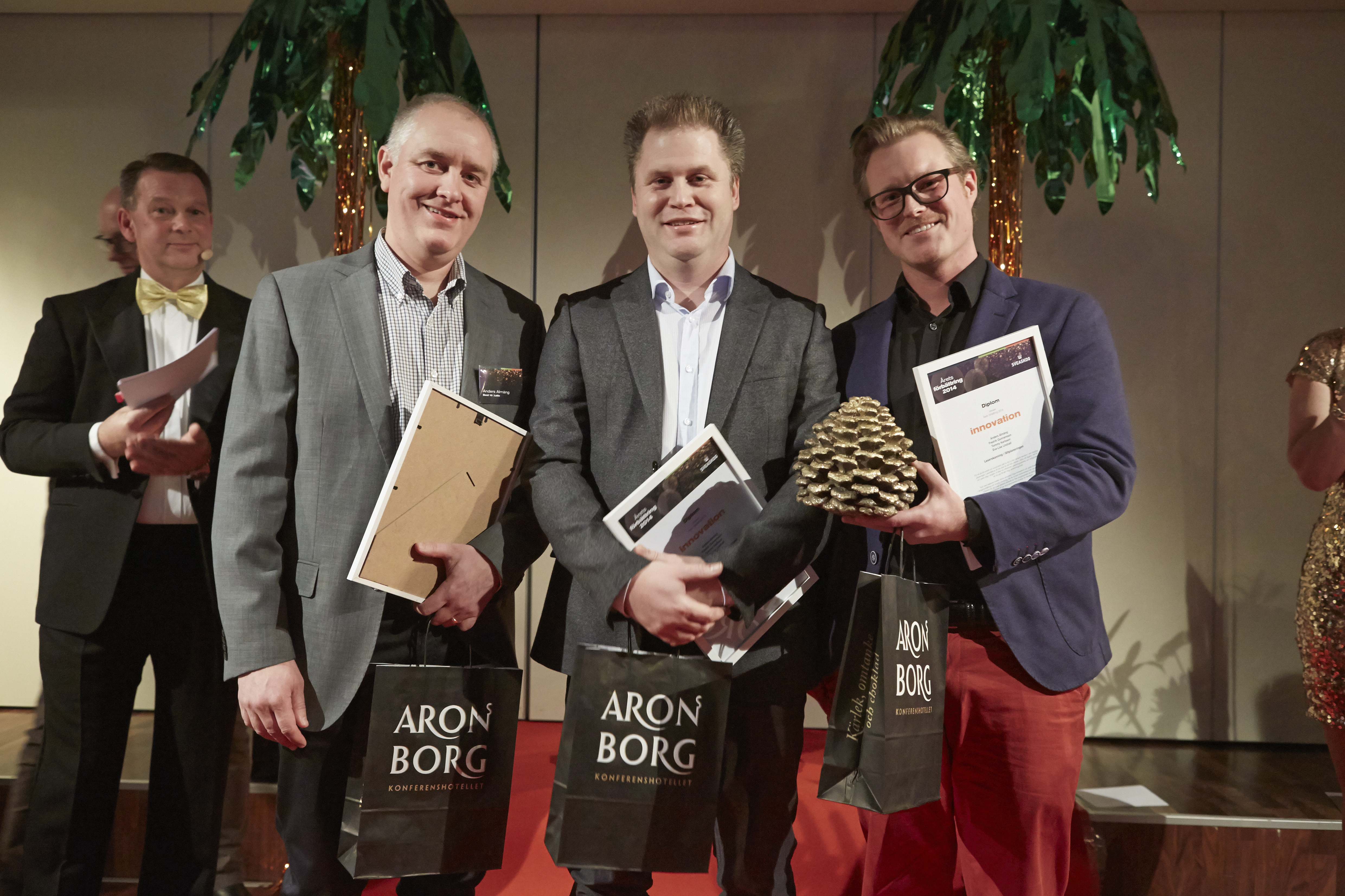 - Beskrivning: Vinnarna av årets förbättring 2014 i kategorin: Innovation, Anders Almäng, Fredrik Gunnarsson och Tommy Karlsson (Eva-Lisa Lindvall var frånvarande) Gala, fest, Aronsborg, konferens, möte, diskussion, ledarmöte, chefsmöte, ledardagar, prisutdelning