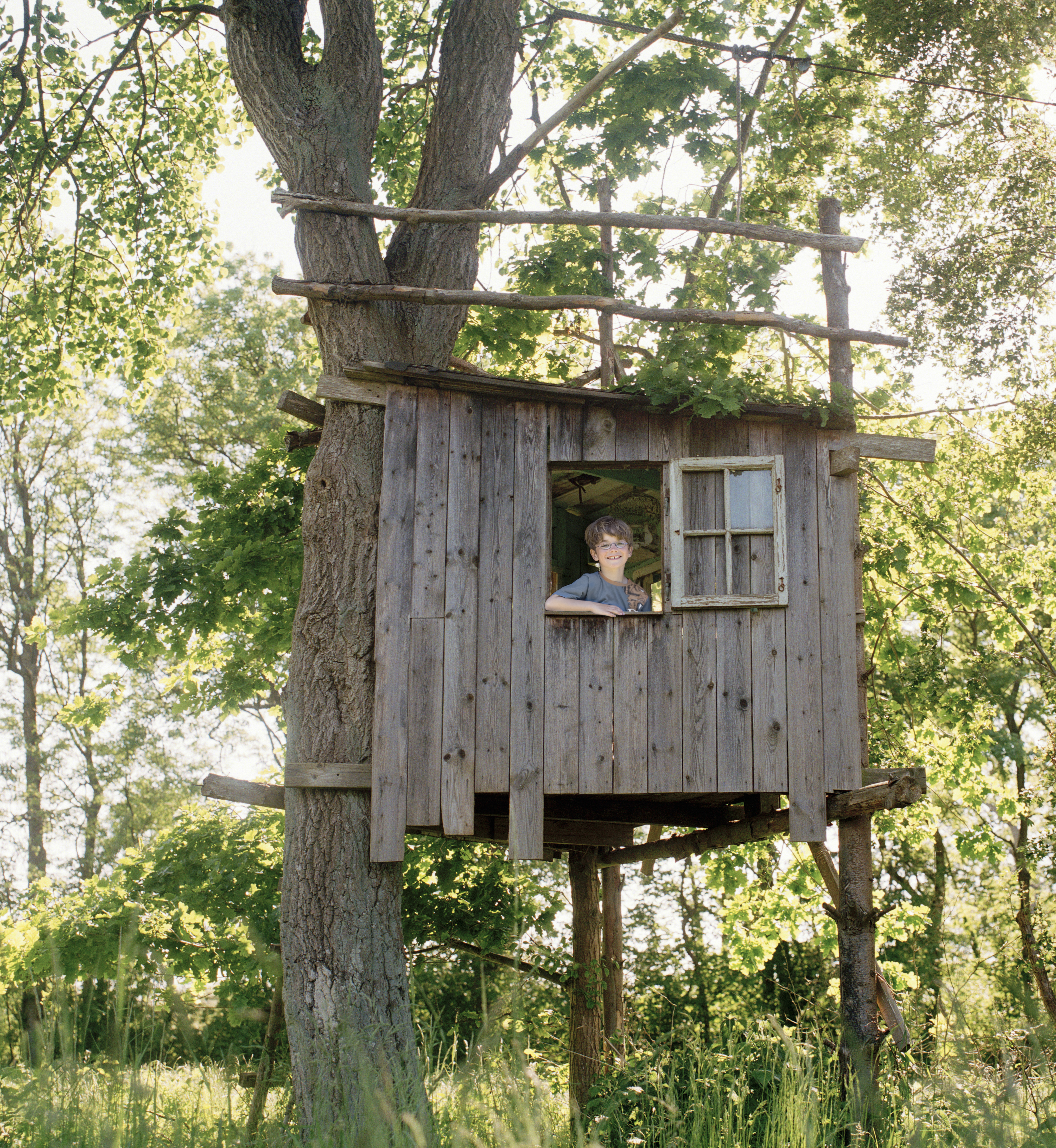 - Beskrivning: Berättelsen om Sveaskog, trädkoja, plankor, koja, friluftsliv, barn, lek, byggnad, konstruktion, genrebild, trähus, stolthet, stolt, lycka, byggare, hemmafixare