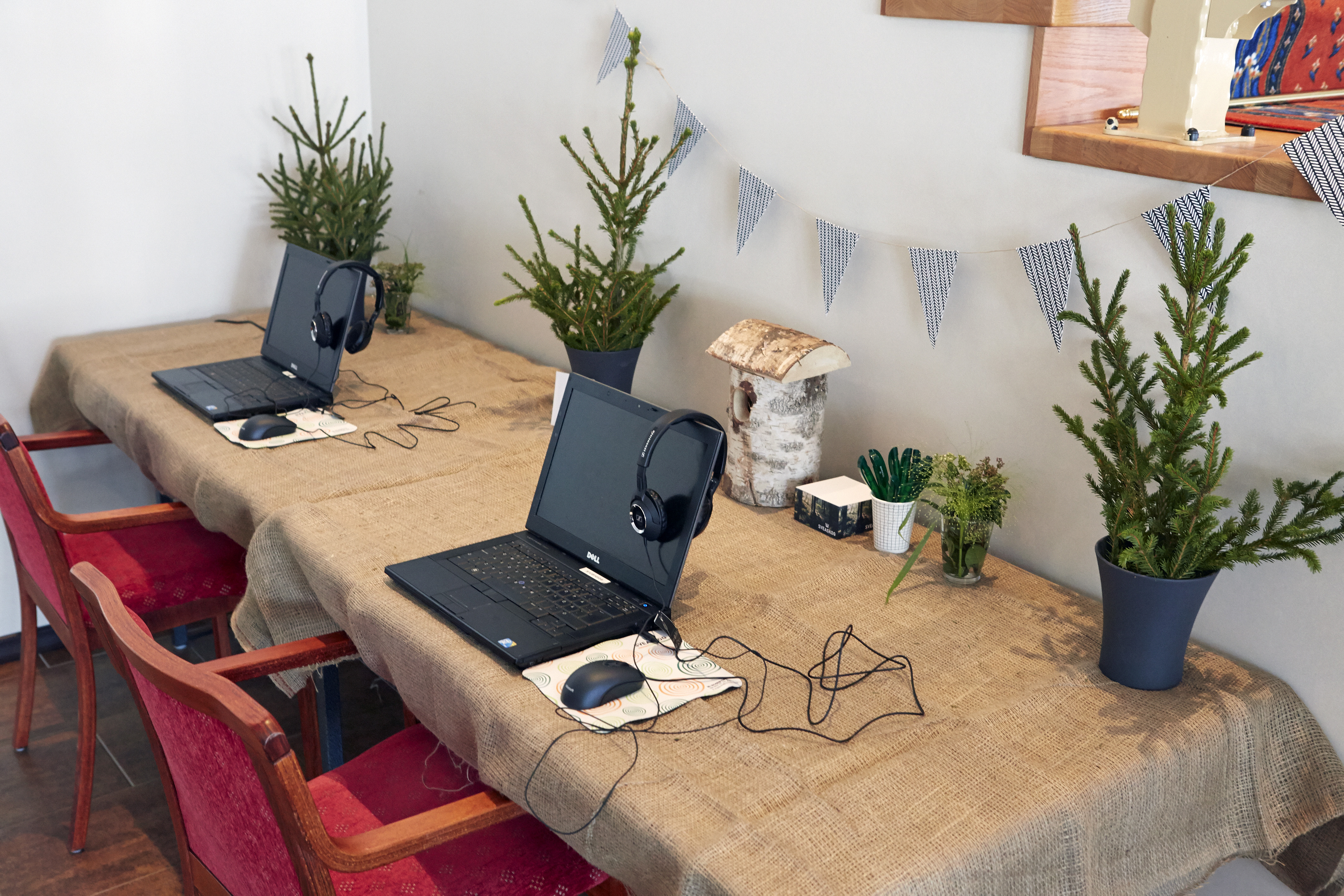 - Beskrivning: Johannesbergs konferensanläggning vid Rimbo utanför Stockholm, ledarmöte 2015, dator, datorer, teknik, bärbar dator, laptop, headphones, hörlurar, display, utställning, gläntor, fem sinnen, glänta