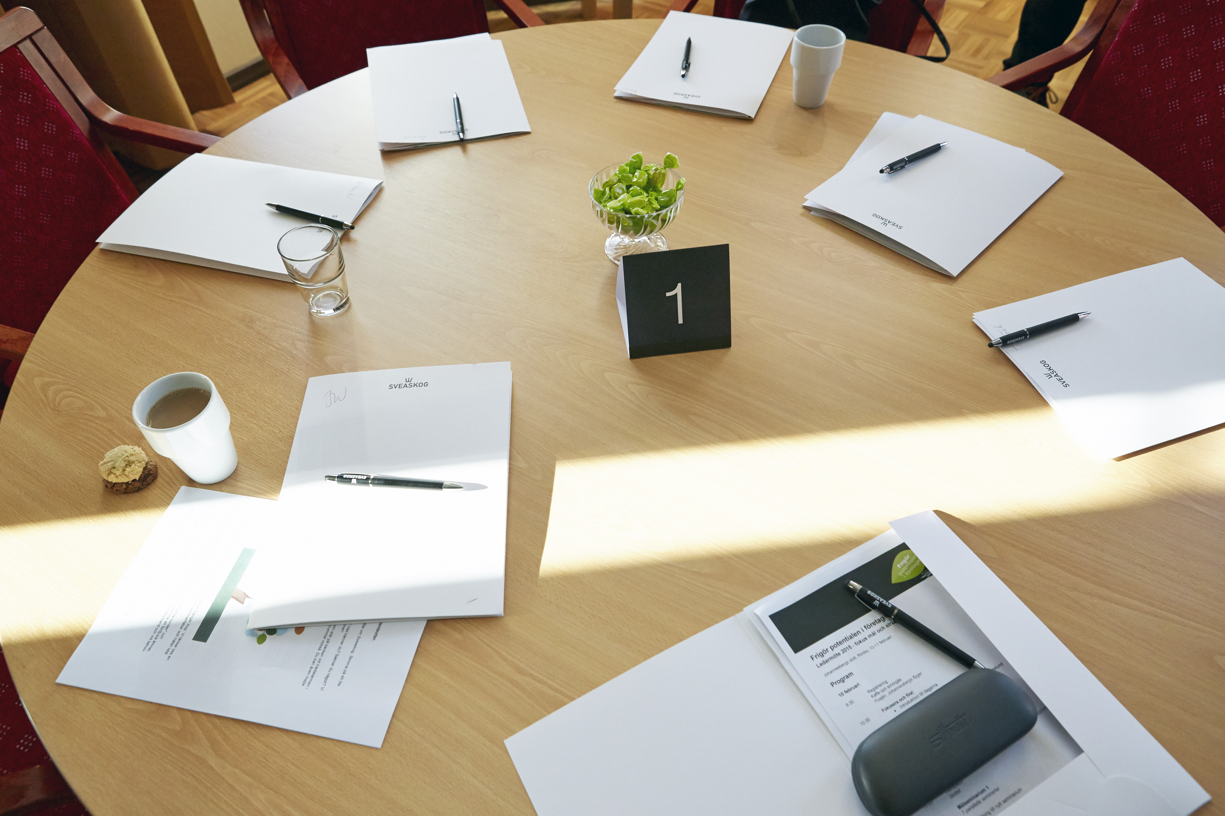 - Beskrivning: Johannesbergs konferensanläggning vid Rimbo utanför Stockholm, ledarmöte 2015, övning, möte, papper, konferens, bord, genrebild