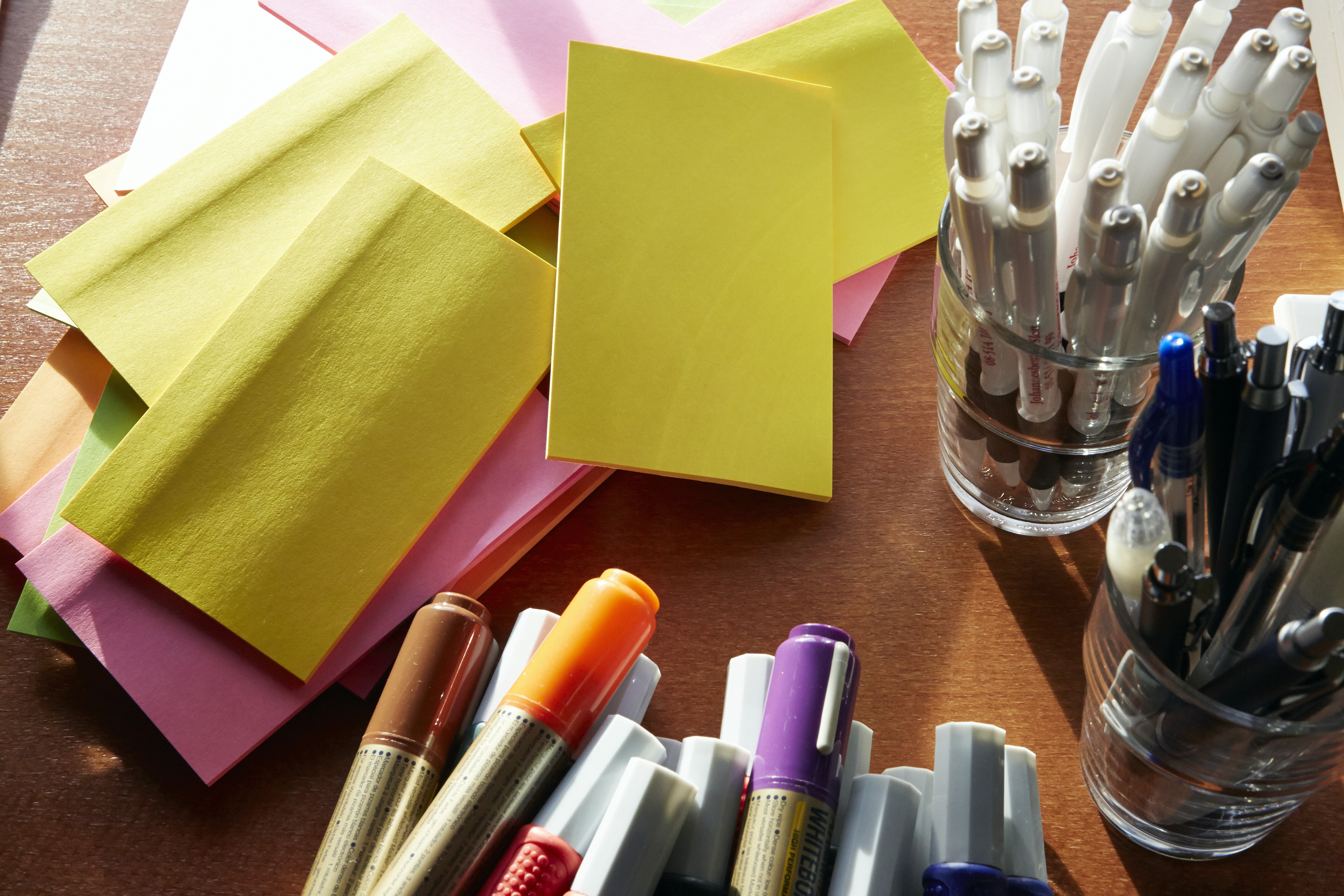 - Beskrivning: Johannesbergs konferensanläggning vid Rimbo utanför Stockholm, ledarmöte 2015, genrebild, kontorsmaterial, post-it, papper, pennor, tusch, tuschpennor, idéer