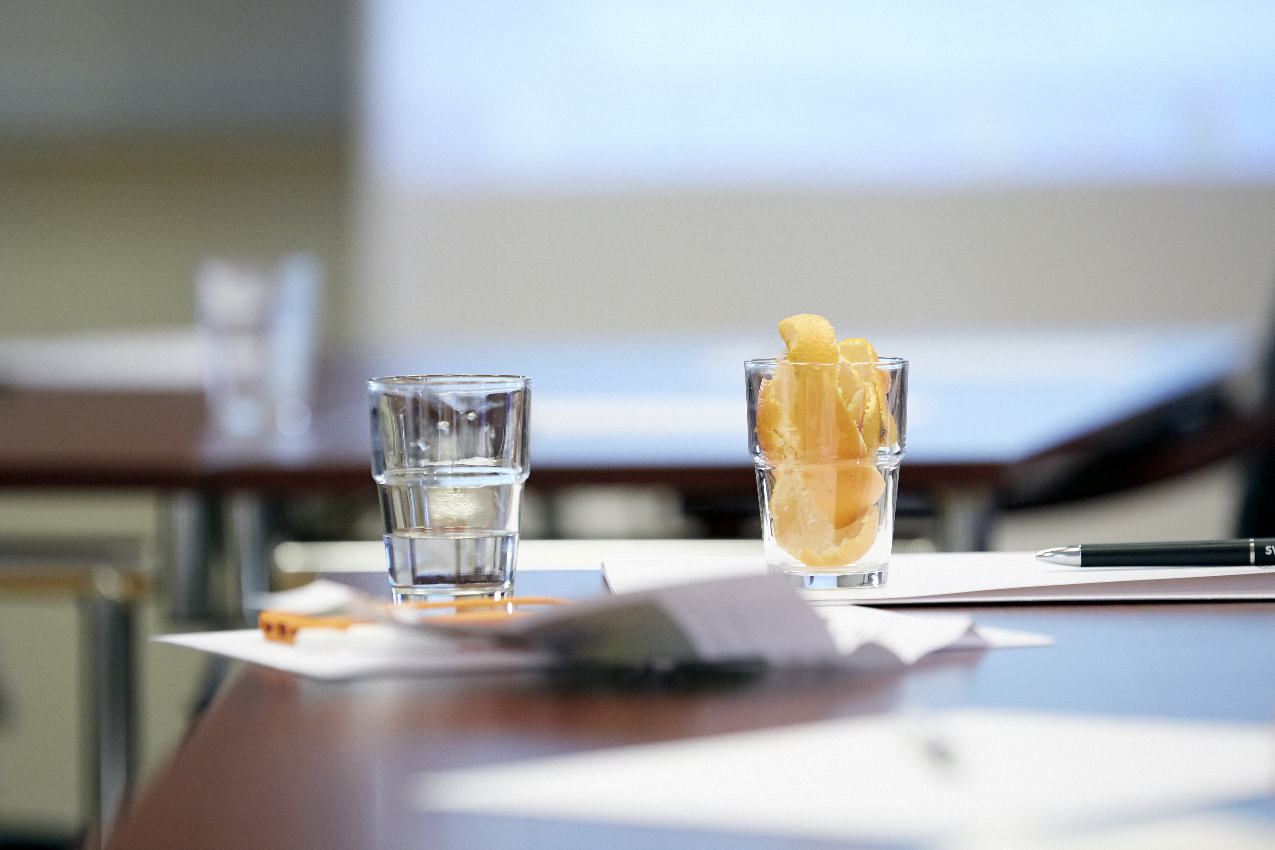 - Beskrivning: Johannesbergs konferensanläggning vid Rimbo utanför Stockholm, ledarmöte 2015, genrebild, apelsinskal, glas, tomt, mat