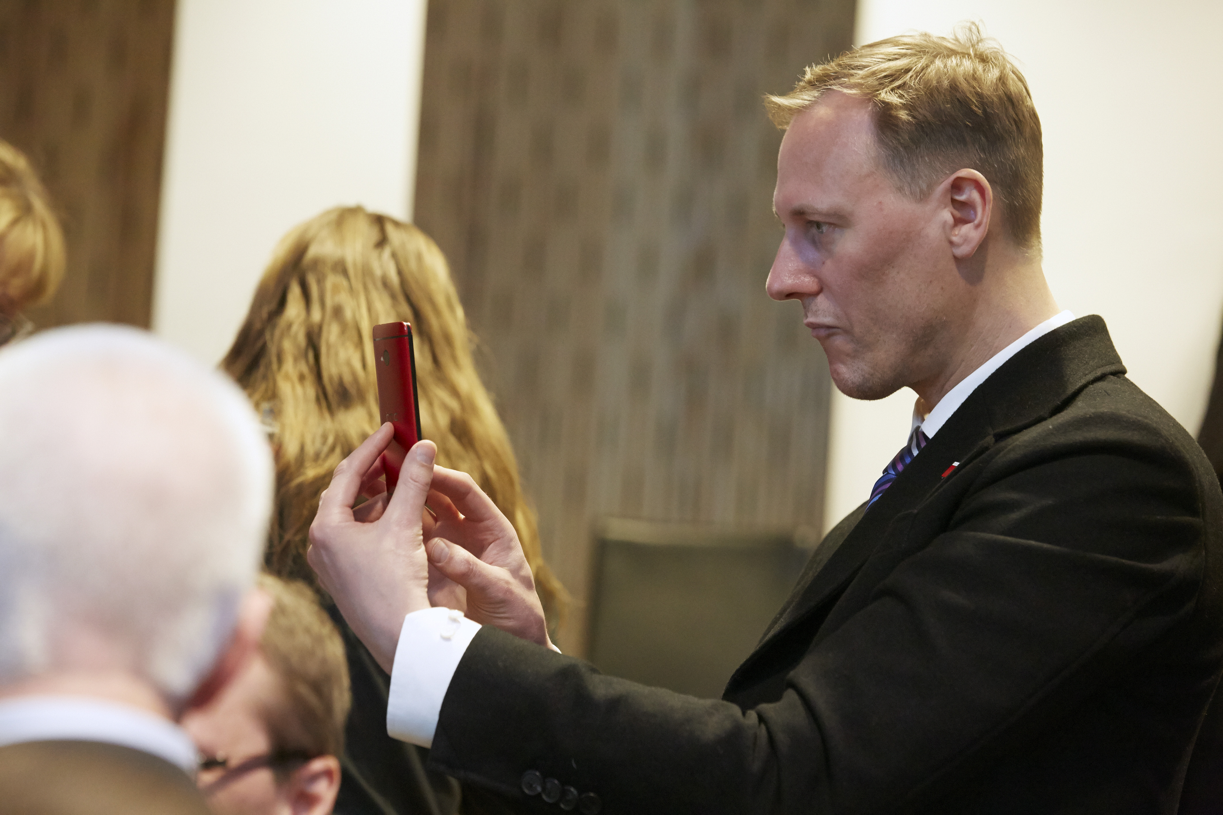 - Beskrivning: Man som dokumenterar seminariet, mobil, tweet, selfie, sociala medier, Seminarium - Skogen är nyckeln för klimatet, Sveaskogs klimatseminarium den 23 april, skogklimat15, klimat