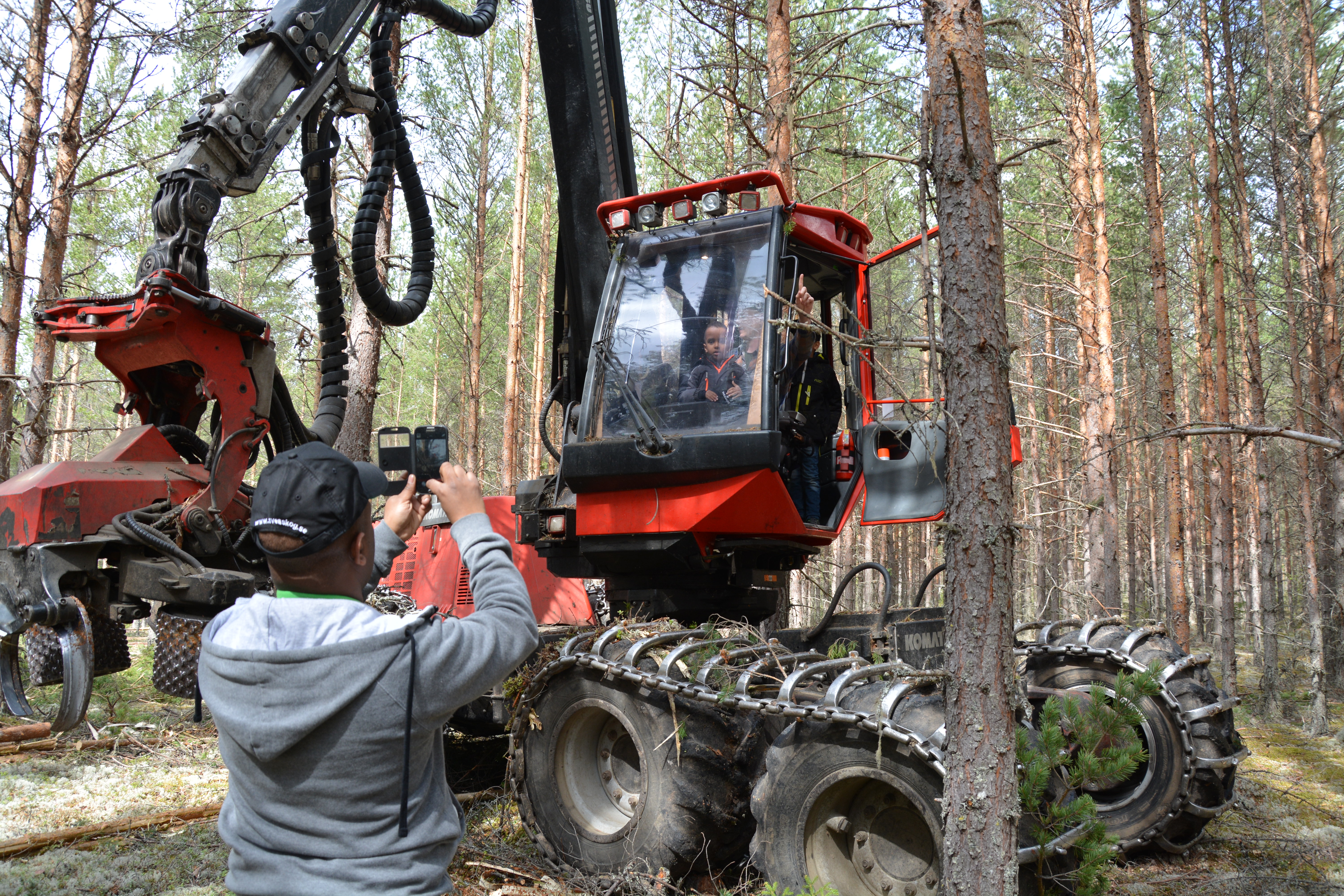 - Beskrivning: Litet barn sittandes i en skördare, blir fotad, mobil, Skogsdag för nysvenskar i Södra Norrland i samarbete med Linnéuniversitetet och VIF, Vänskap och Integrationsföreningen