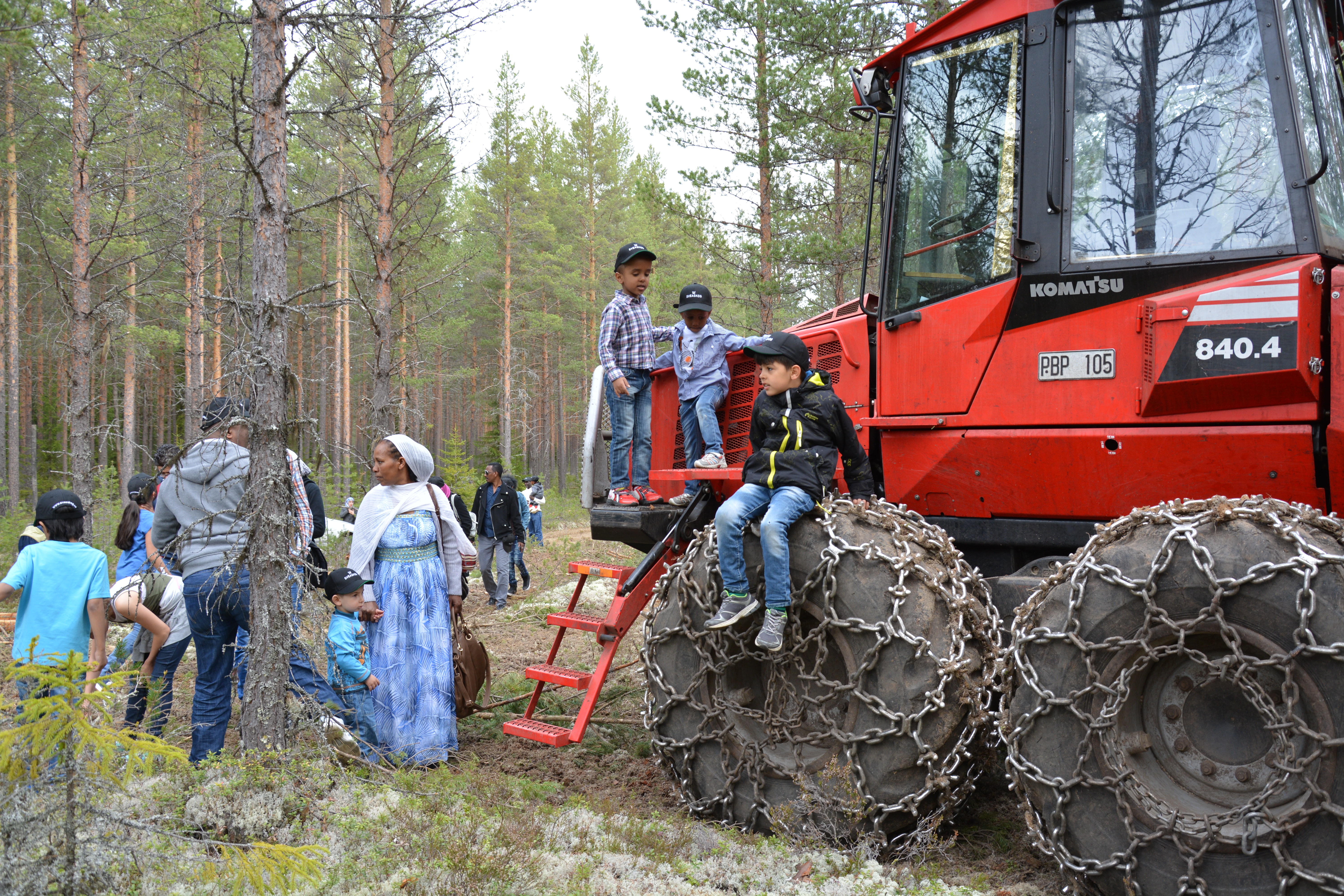 - Beskrivning: Barn som sitter på en skördare, Skogsdag för nysvenskar i Södra Norrland i samarbete med Linnéuniversitetet och VIF, Vänskap och Integrationsföreningen