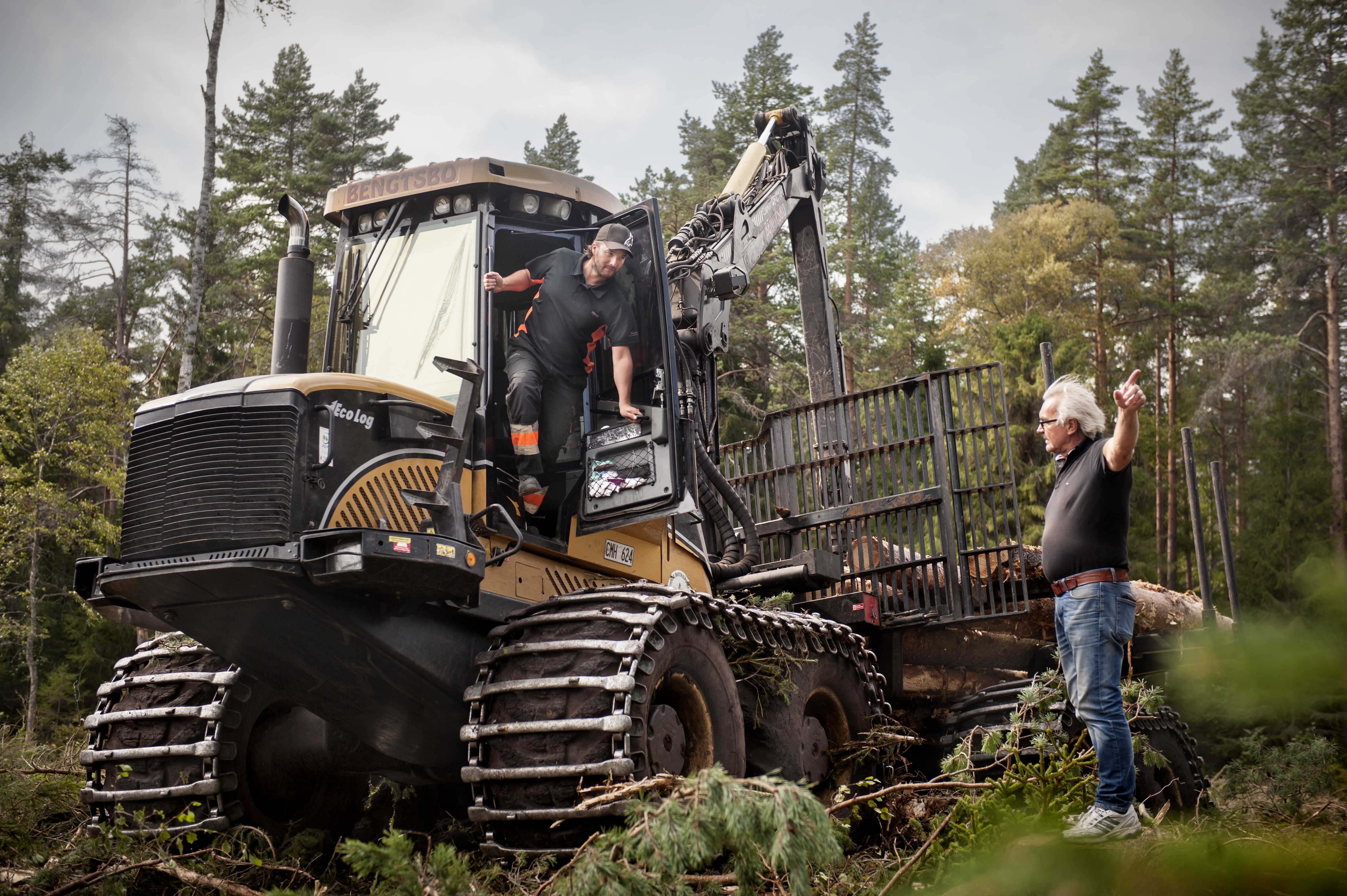 - Beskrivning: Avverkningsledaren Peter Andersson, till höger, har inväntat exakt rätt tidpunkt för avverkning kring Örbyhus i Uppland. När den väl var kommen kopplades flera entreprenörer in för samarbete. Jani Hongisto från Bengtsbo skogsentreprenad är dem. Avverkning Orbyhus