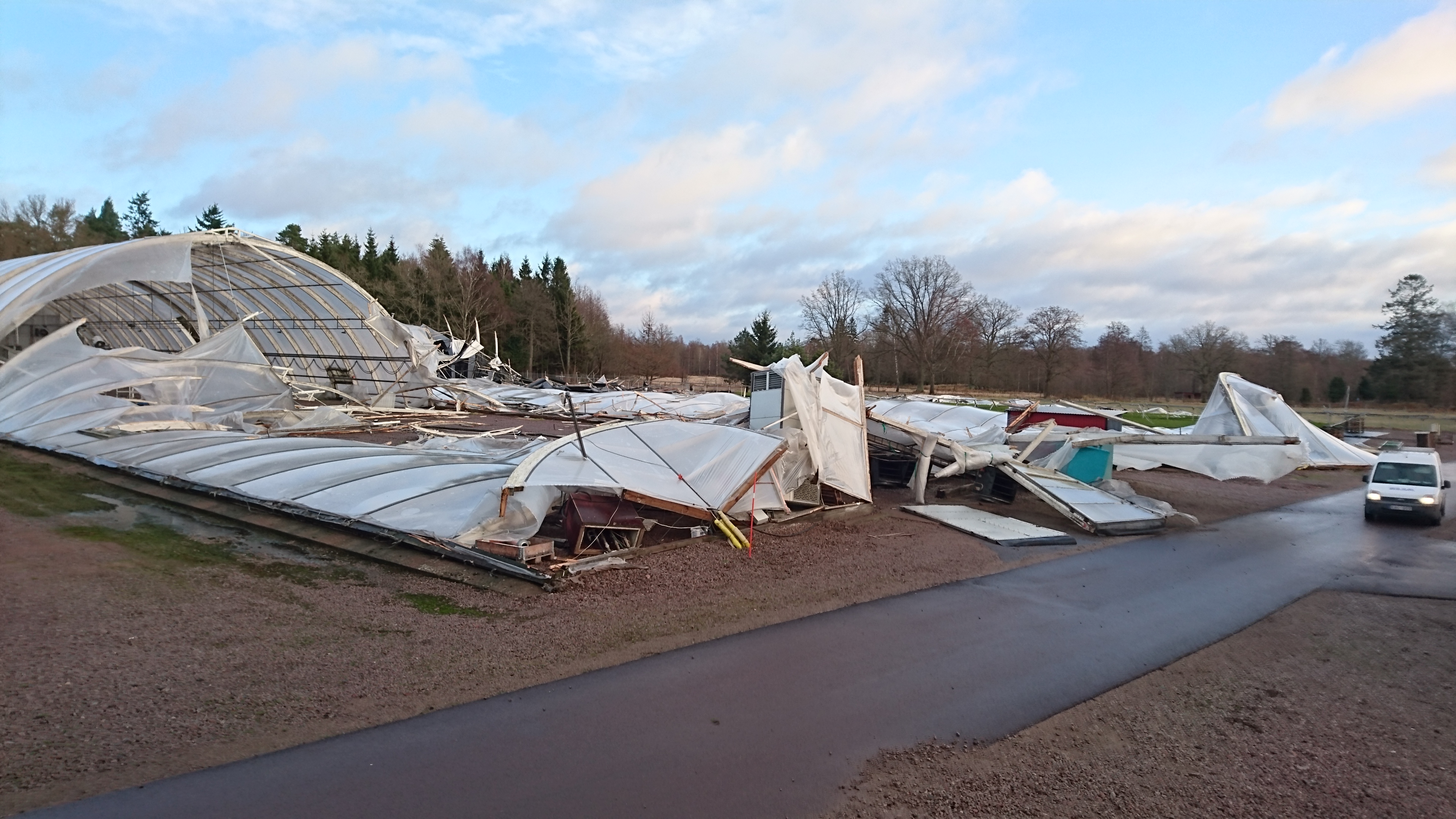 - Beskrivning: Stormskador på Trekantens plantskola, Stormen Gorm, två växthus som blåsts ner