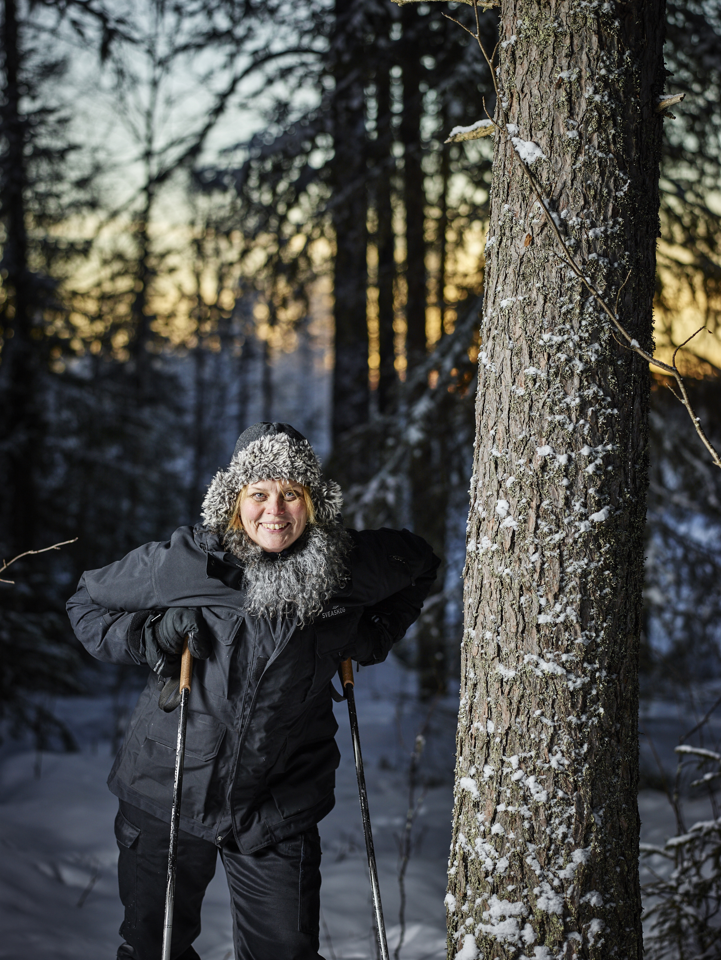 - Beskrivning: Annika Tegbro, skoglig fältassitent, snö, skidor, skog, Rum för både ren och skog, Forum Sveaskog nr 1 2016