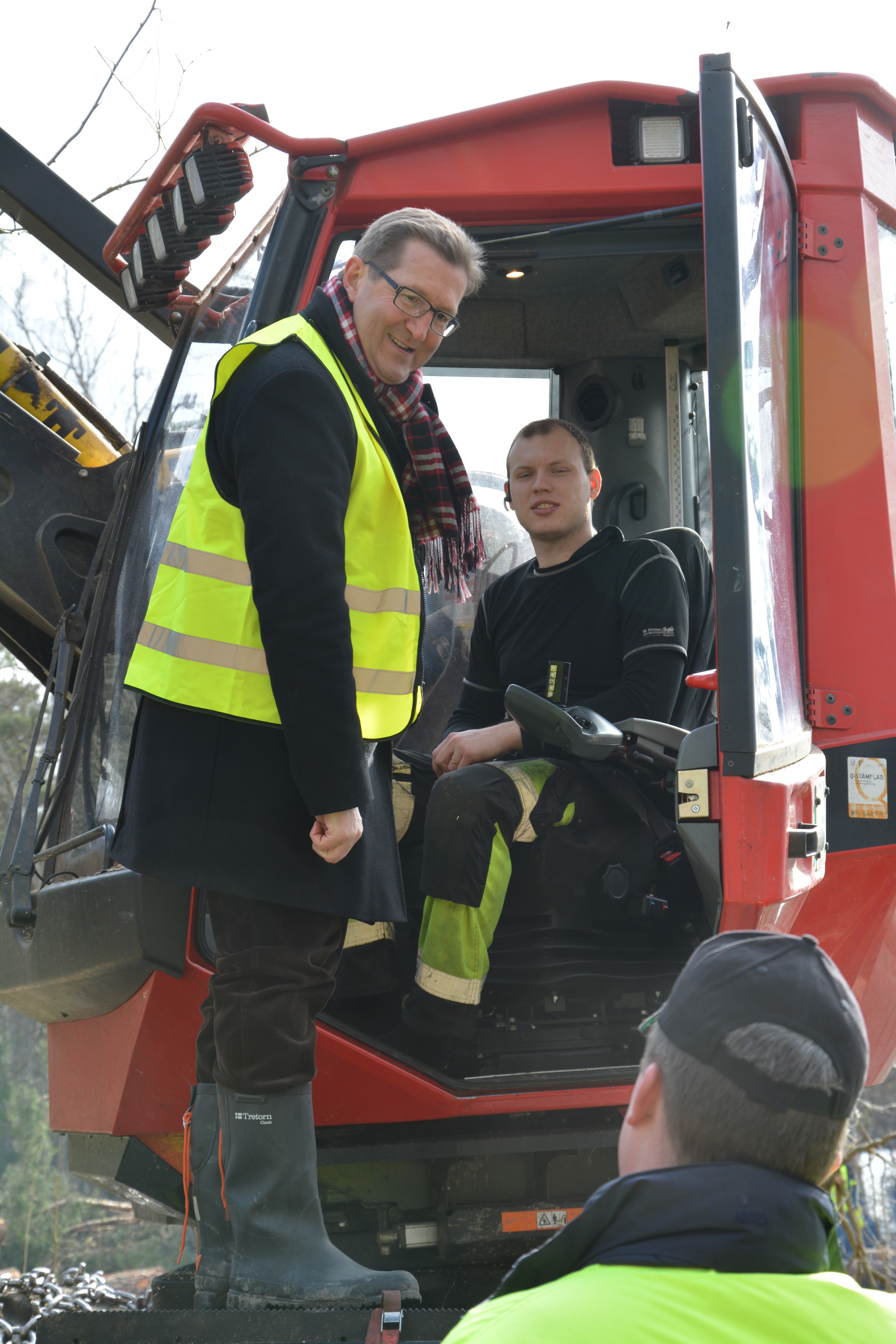 - Beskrivning: Tyske statssektreteraren kikar in i skogsmaskin, Sveaskog gästades av den tyske statssekreteraren för jordbruk Dr. Robert Kloos, samt representanter för Näringsdepartementet. Exkursion, skogsbesök, fältbesök, studiebesök, besök i verksamheten, verksamhetsbesök