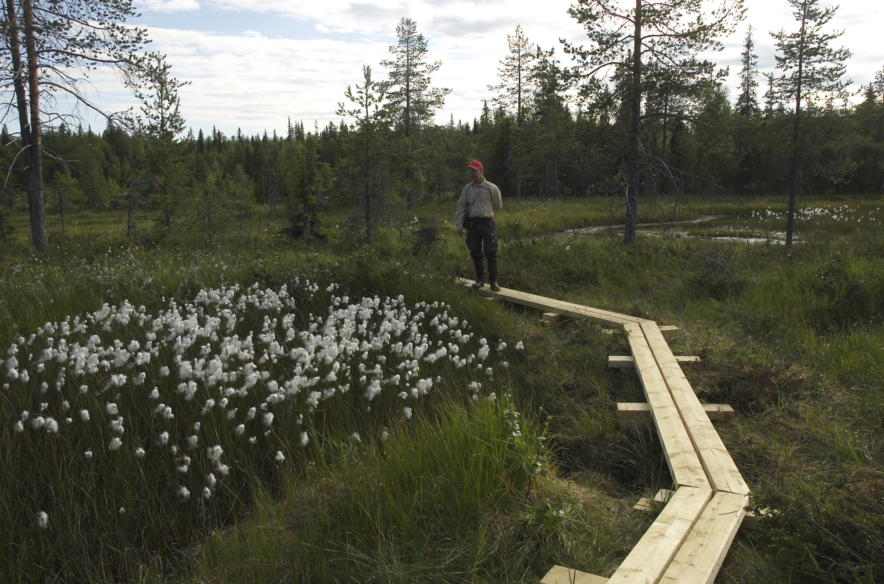 - Beskrivning: Ekopark Rautiorova, man som vandrar längs en spång på myr