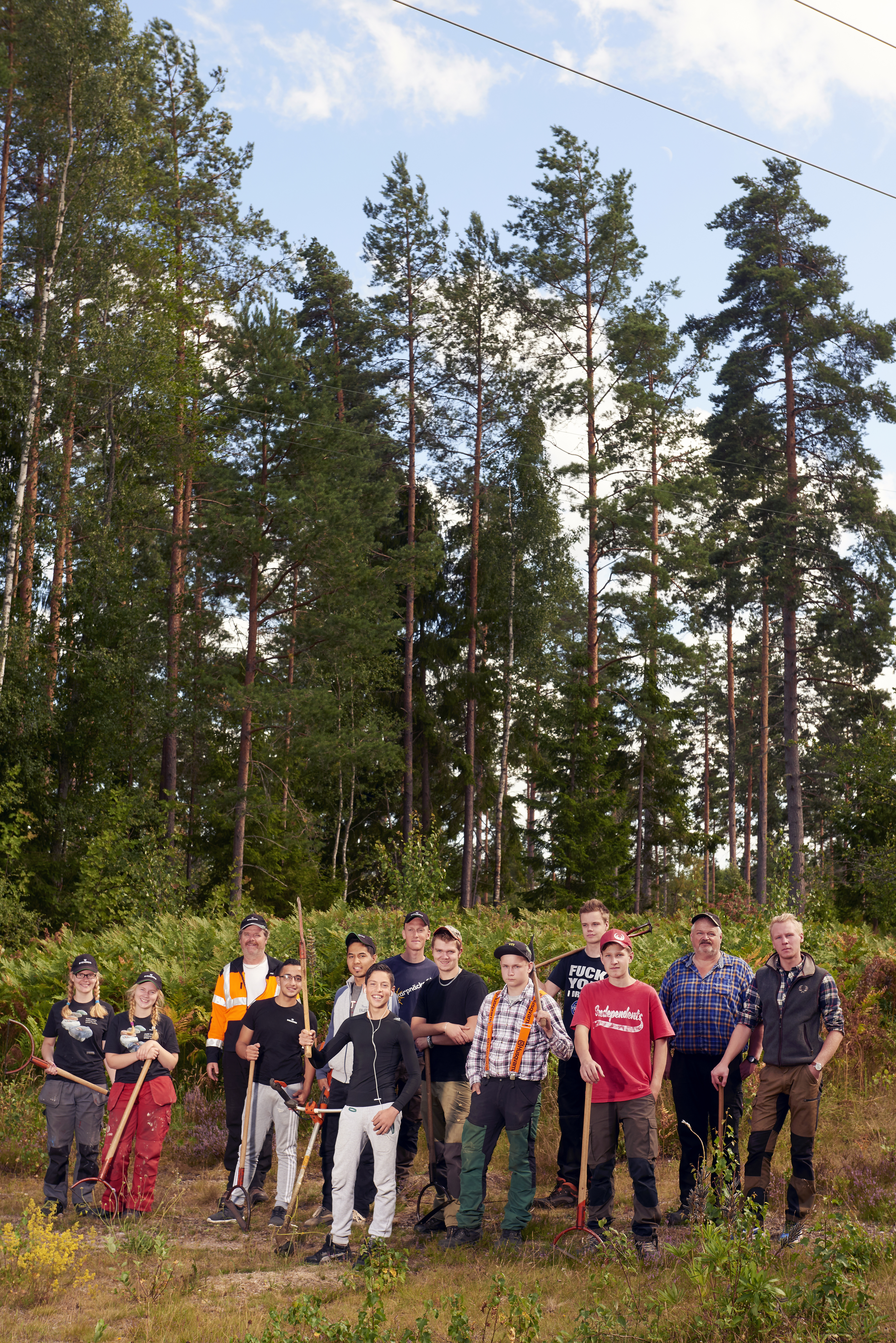 - Beskrivning: Gruppbild på sommarjobbare i Vimmerby, Under uppsyn av skogsvårdare Bo Johansson har 12 sommarjobbare jobbat med huvudsakligen markberedning och avverkning. Insatsen är en del av Sveaskogs integrationsprojekt Växtkraft!