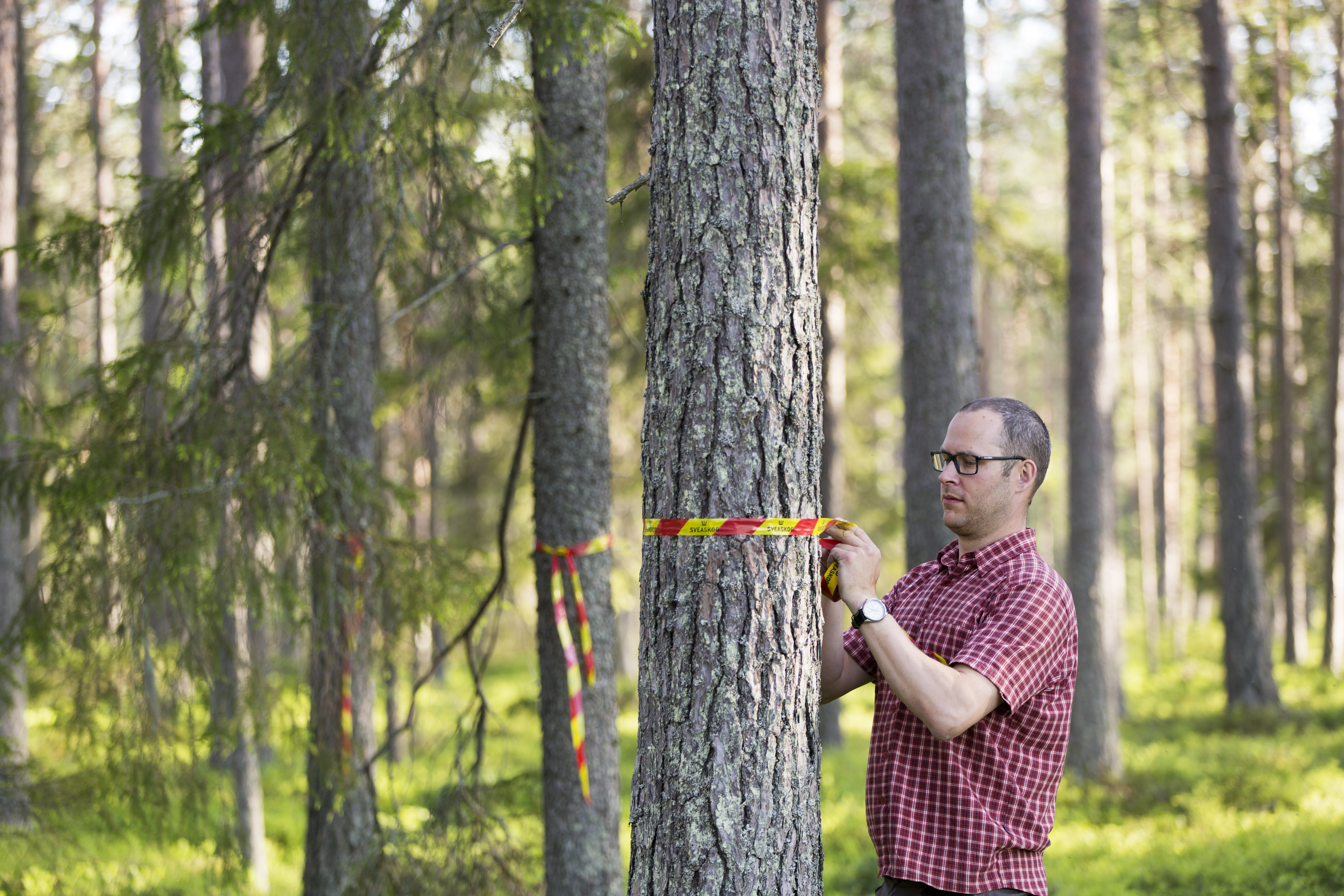 - Beskrivning: Jan-Erik Berglund, sätter snitsel runt träd, naturvårdsmärkning, Virkesköpare, planerare, kund, skogsägare, skoglig fältassistent