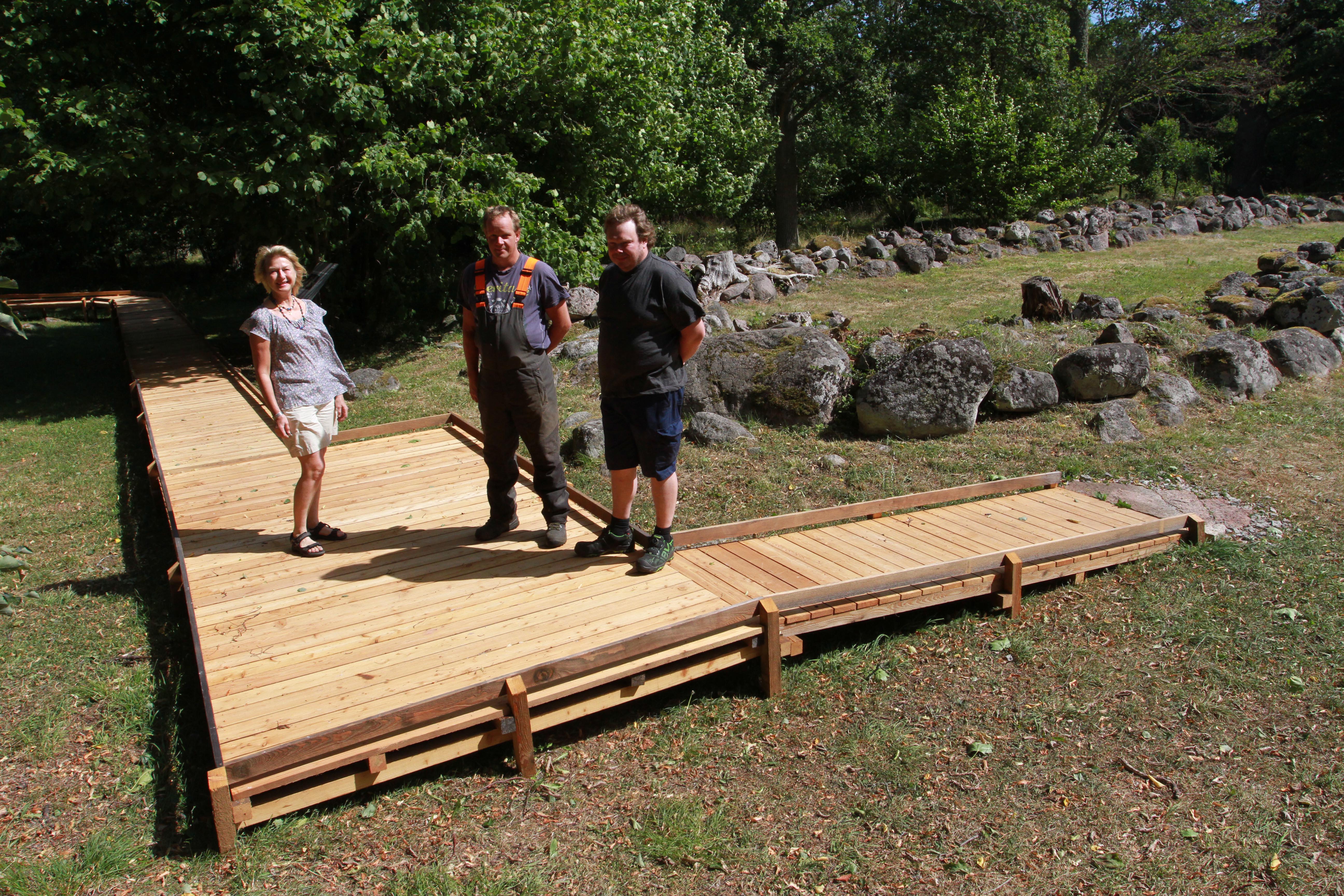 - Beskrivning: Guiden Aili Käärik tillsammans med de två snickrande skogsentreprenörerna Niklas Andersson och Magnus Gillsjö. Nybyggd gångbro ökar tillgängligheten i Ekopark Böda, ramp