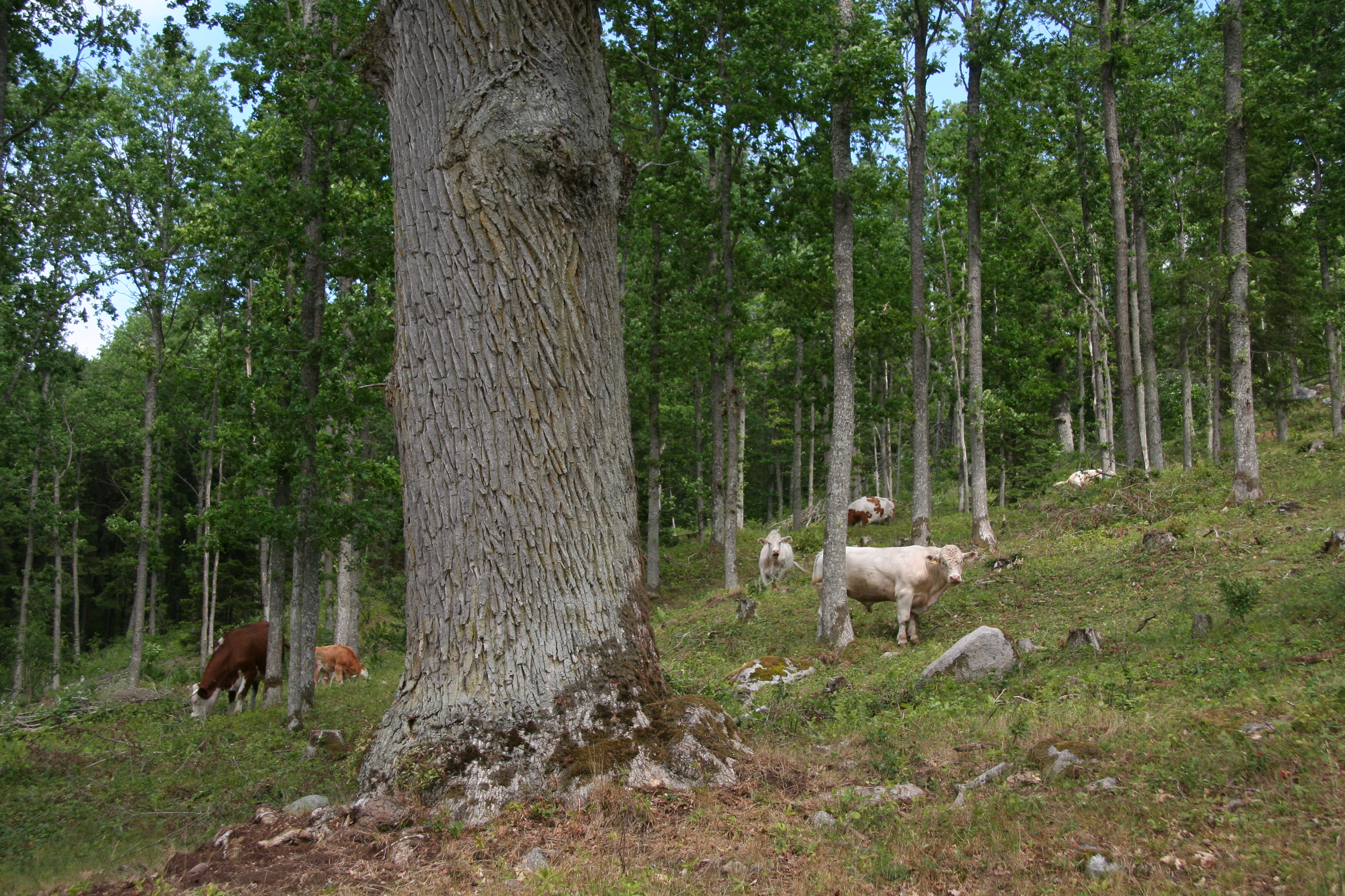 - Beskrivning: Jätteek i beteshage. Kor, kreatur, Ekopark Omberg.