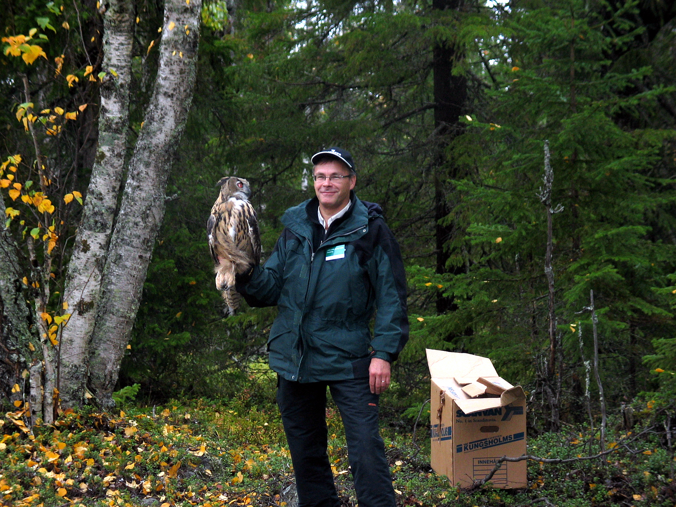 - Beskrivning: Medarbetare med berguv, uggla, rovfågel. Invigning av Ekopark Rosfors.