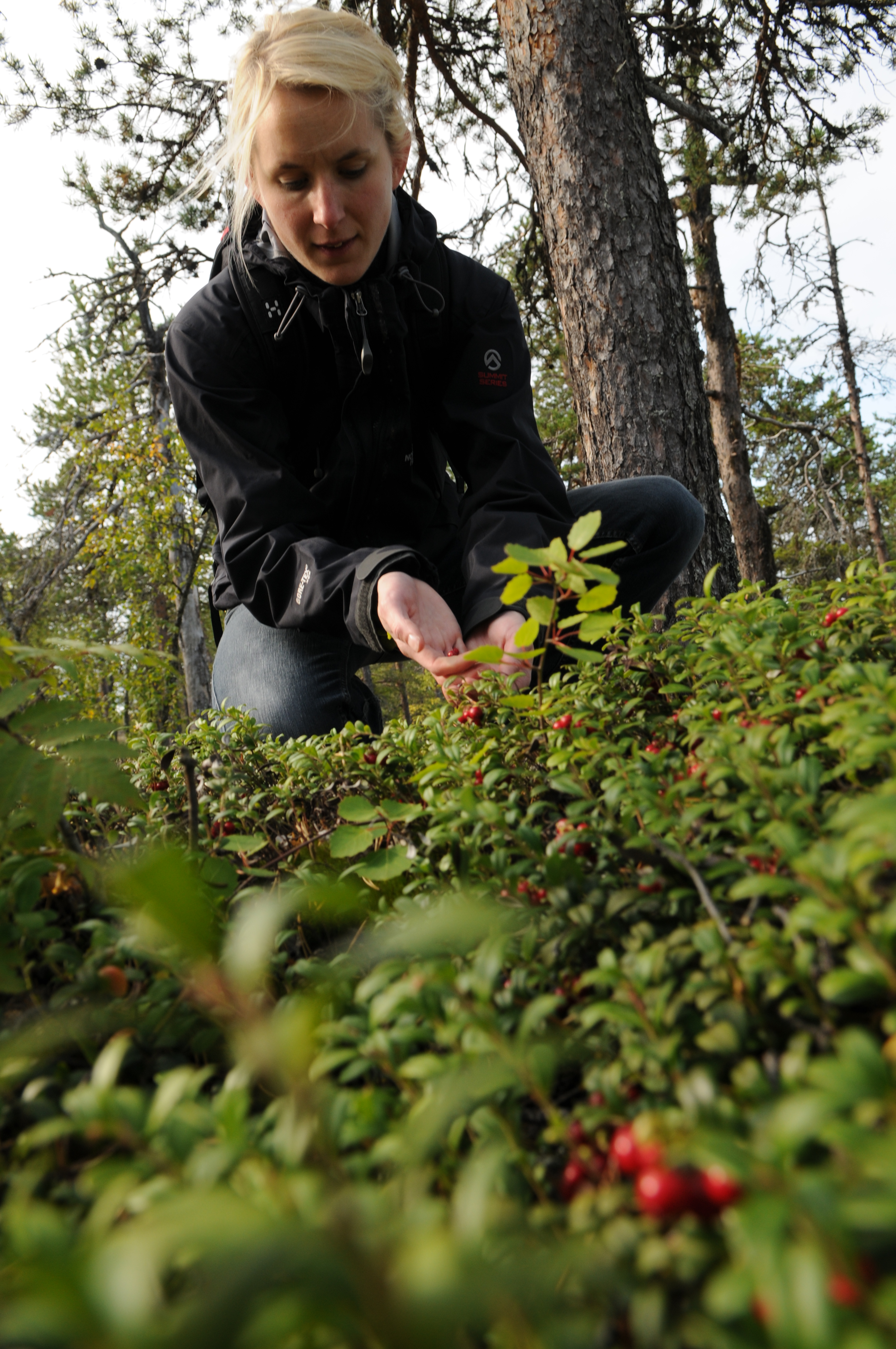 - Beskrivning: Kvinna som plockar bär, lingon, i Ekopark Rosfors, bärplockning