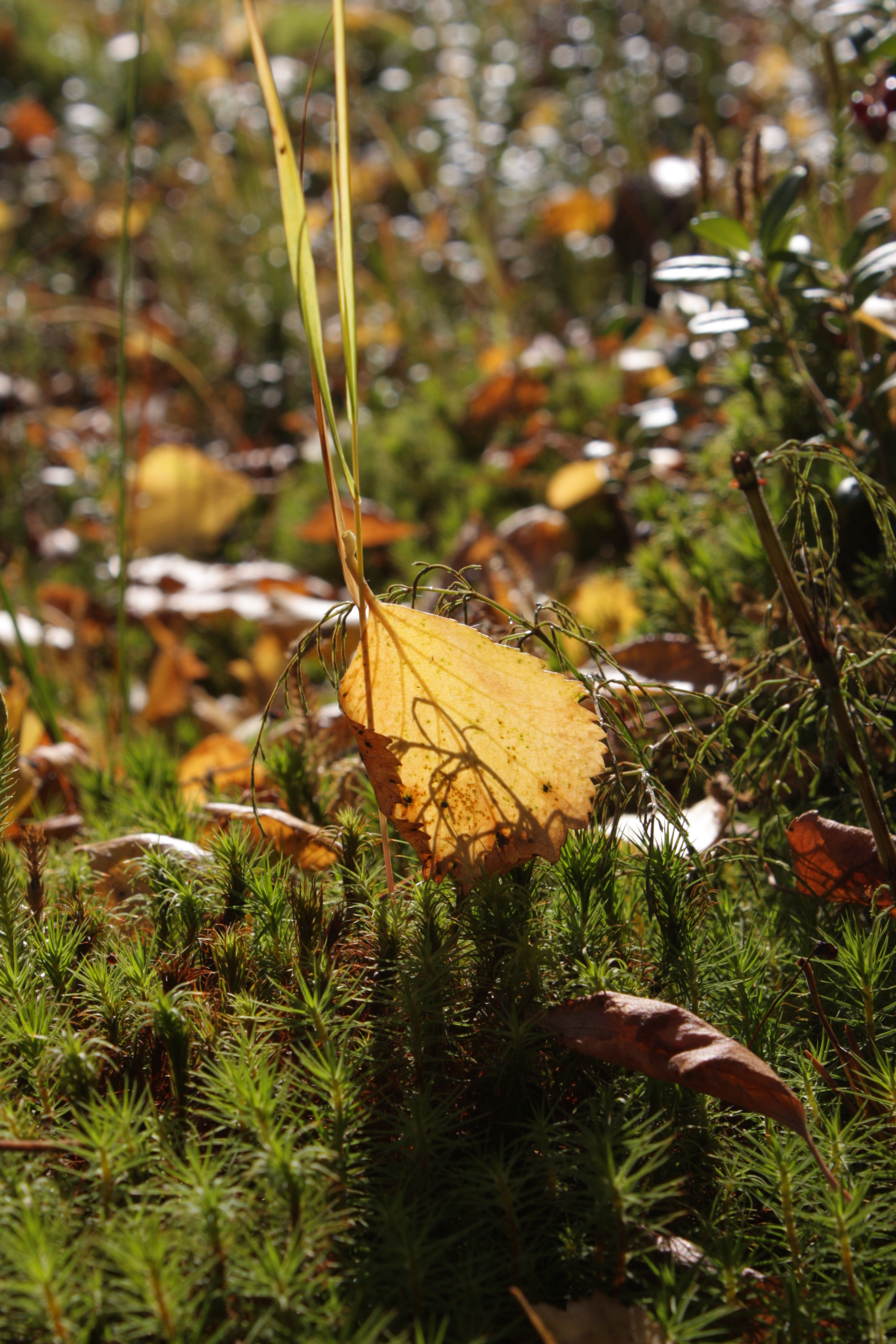 - Beskrivning: Ekopark Naakajärvi, höstfärgat björklöv som landat i björnmossan, Aareajoki