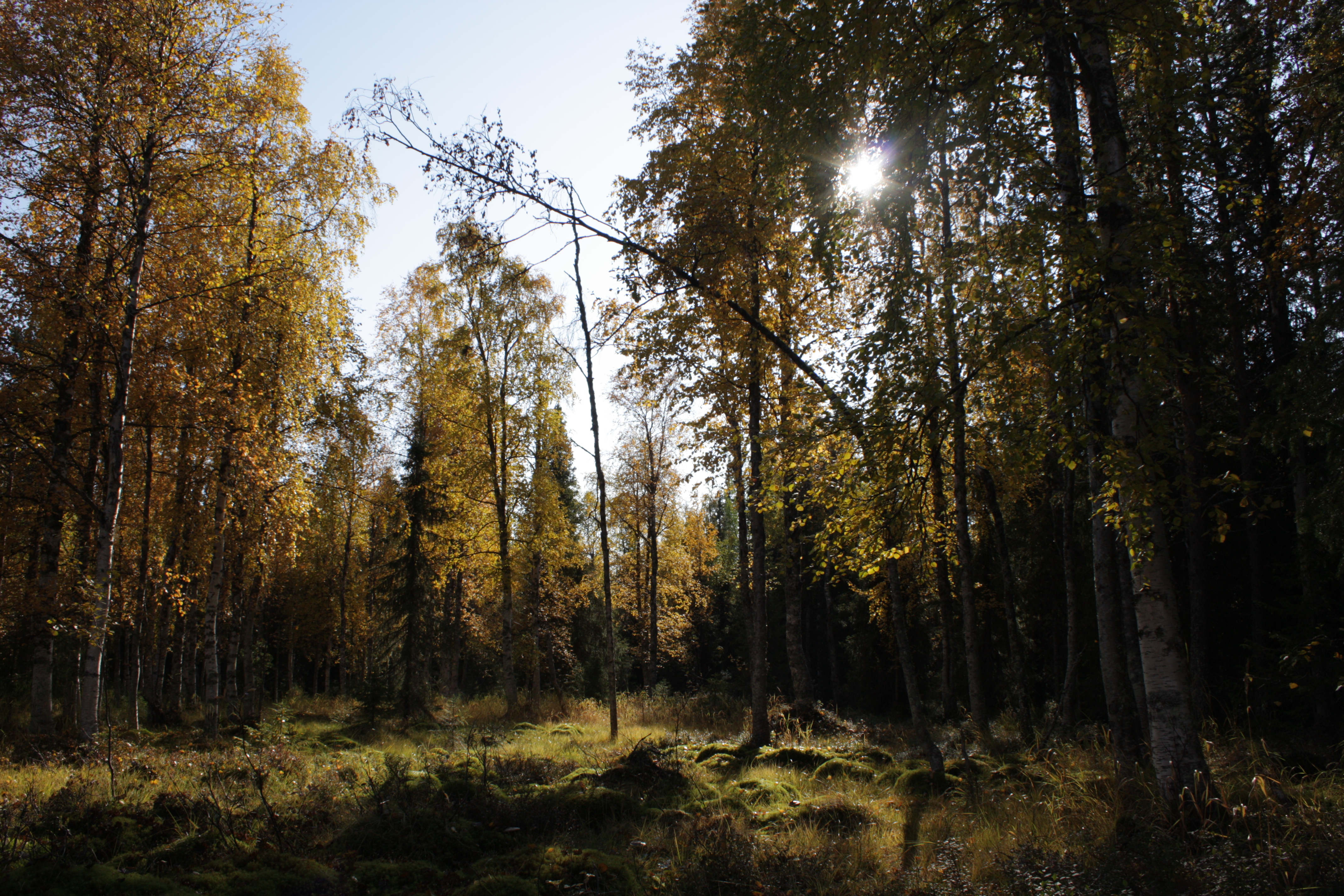 • Beskrivning: Ekopark Naakajärvi, lövrik glänta i mystiskt ljus, intill Aareajoki