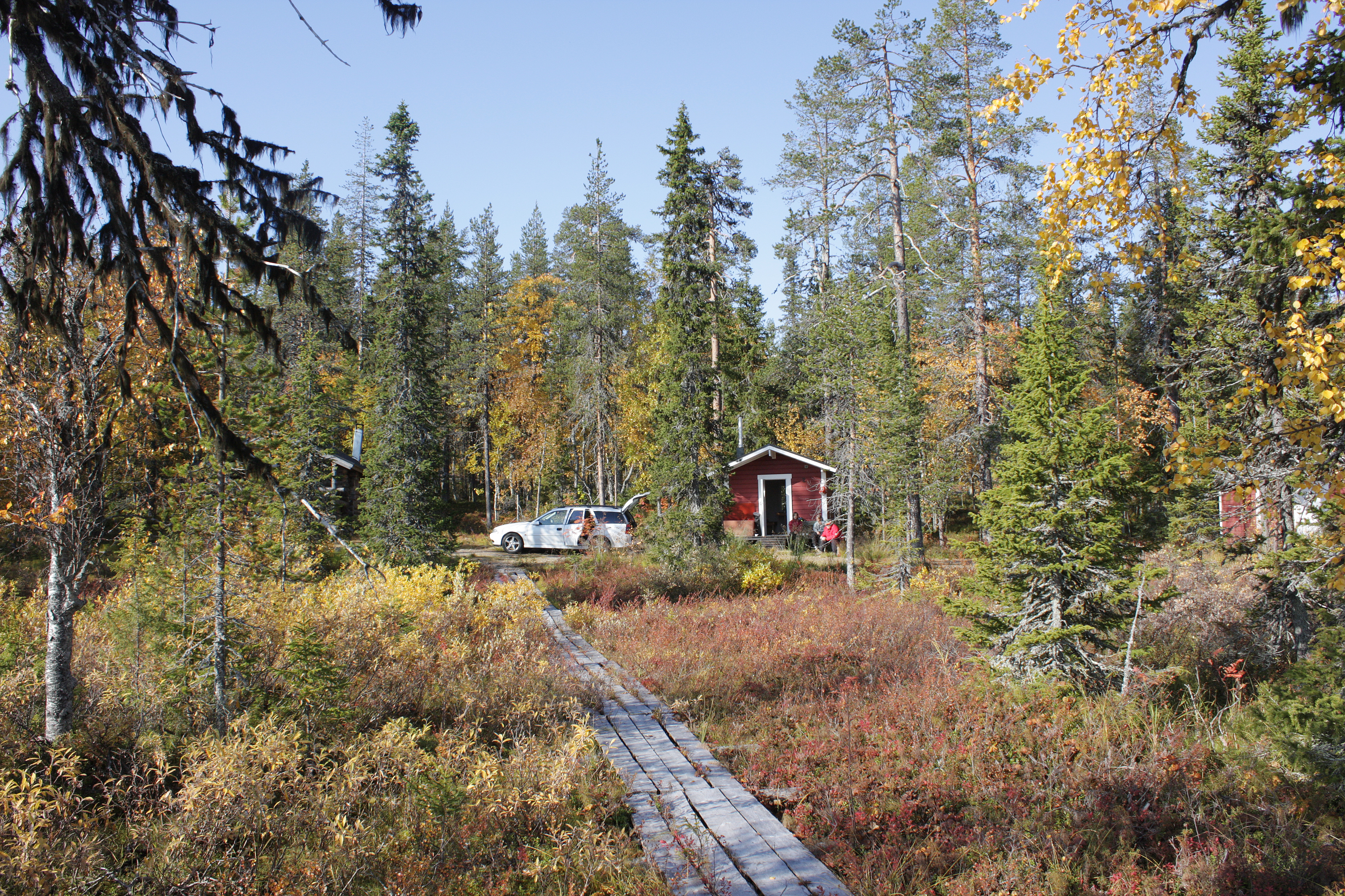 - Beskrivning: Ekopark Naakajärvi, spång på väg mot fiskestuga vid Naakajärvi. Skägglav i förgrund.