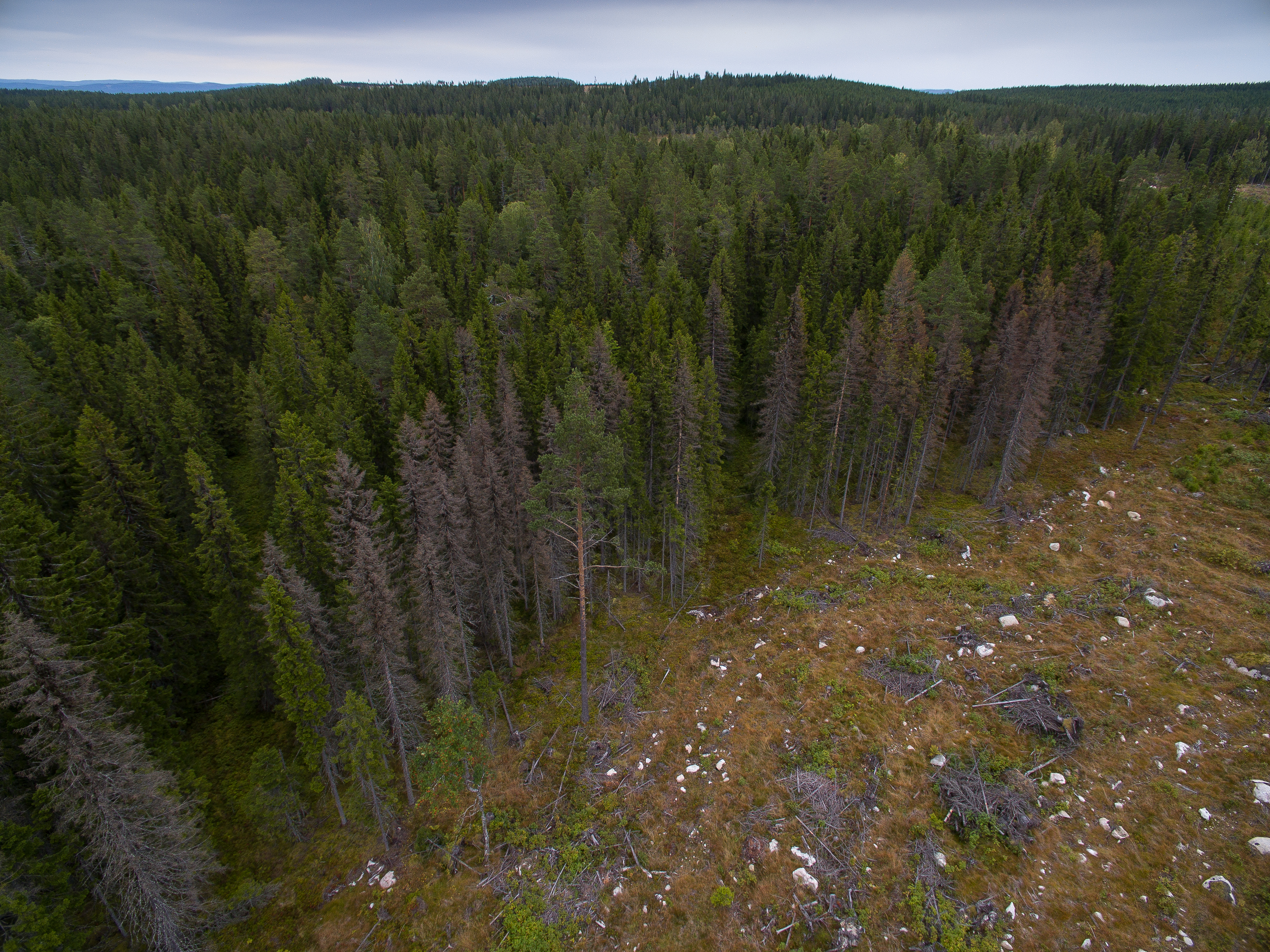 - Beskrivning: Granbarkborre-angrepp i Södra Norrland, barkborre, granbarkborre, skador på skog, barkborreangripen skog, skadade träd