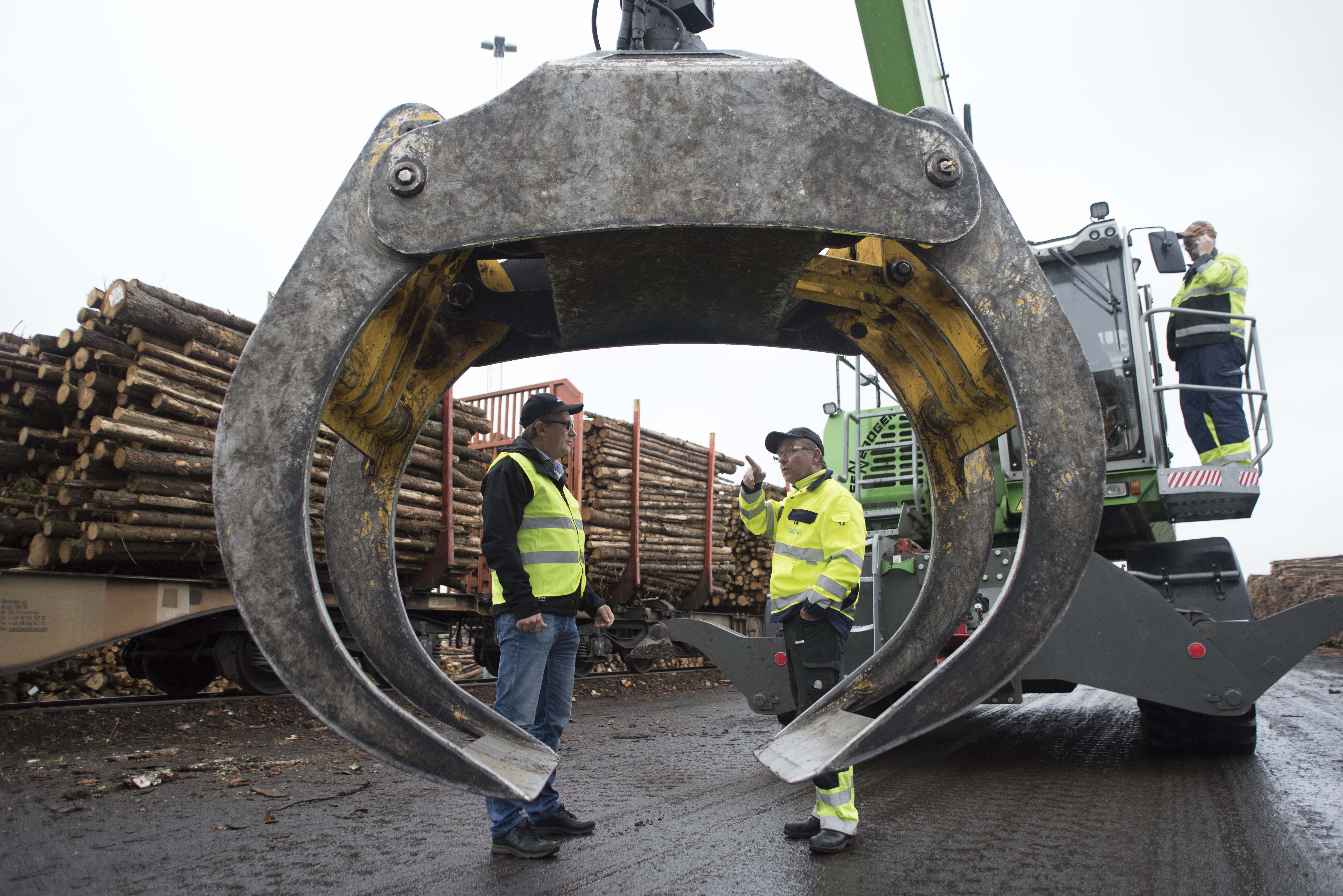 - Beskrivning: Mats Haapala på Stockarydsterminalen AB och Krister Bergman, logistiker på Sveaskog, Tåglast med massaved från Stockaryd till Östrand, sommaren 2018 ska SCA:s nya stora massafabrik stå färdig, för att det ska hända behövs massor av råvara, timmerleverans