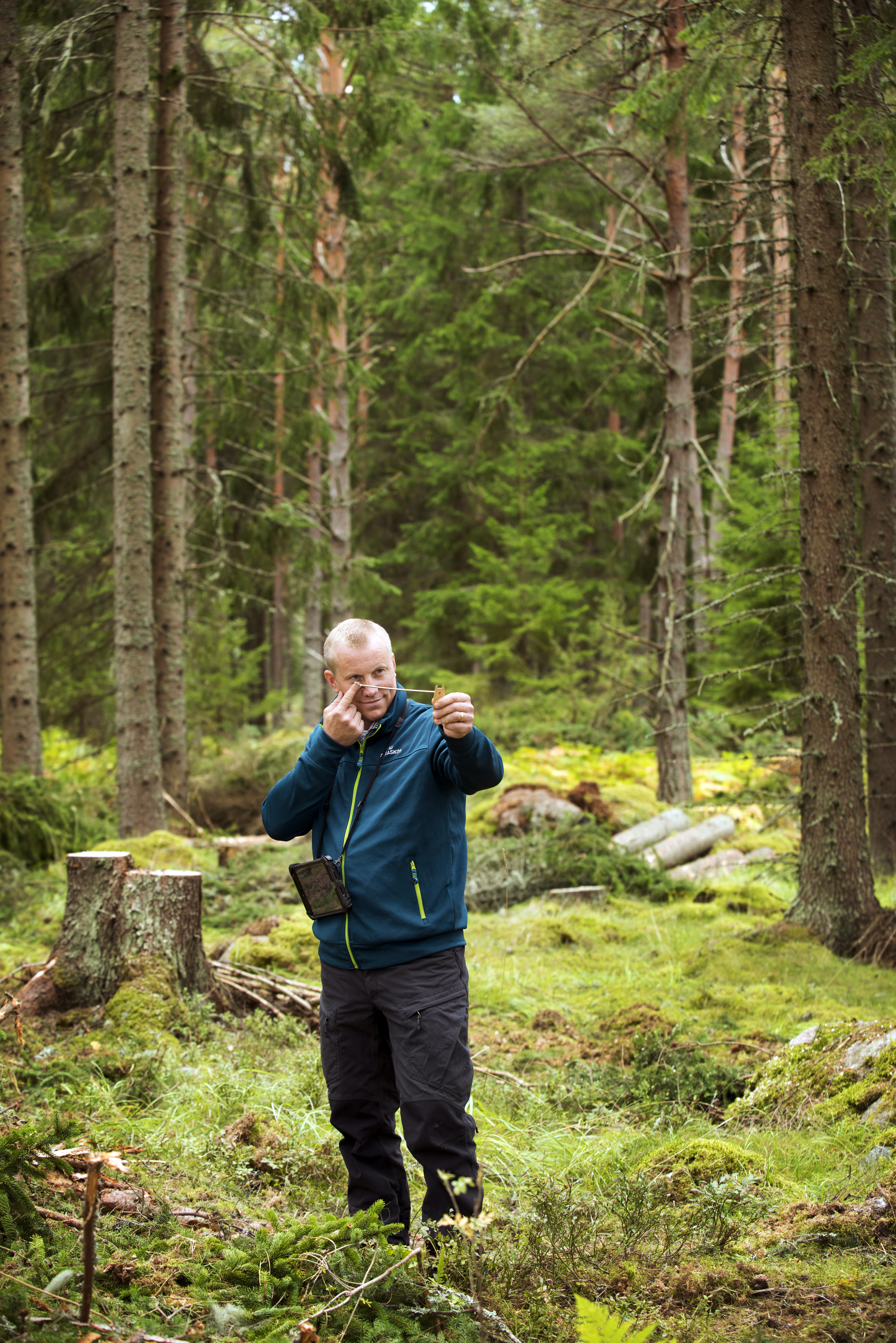 - Beskrivning: Henrik Öhman, virkesköpare, bestämma trädhöjd, höjdmätare, instrument, mätning