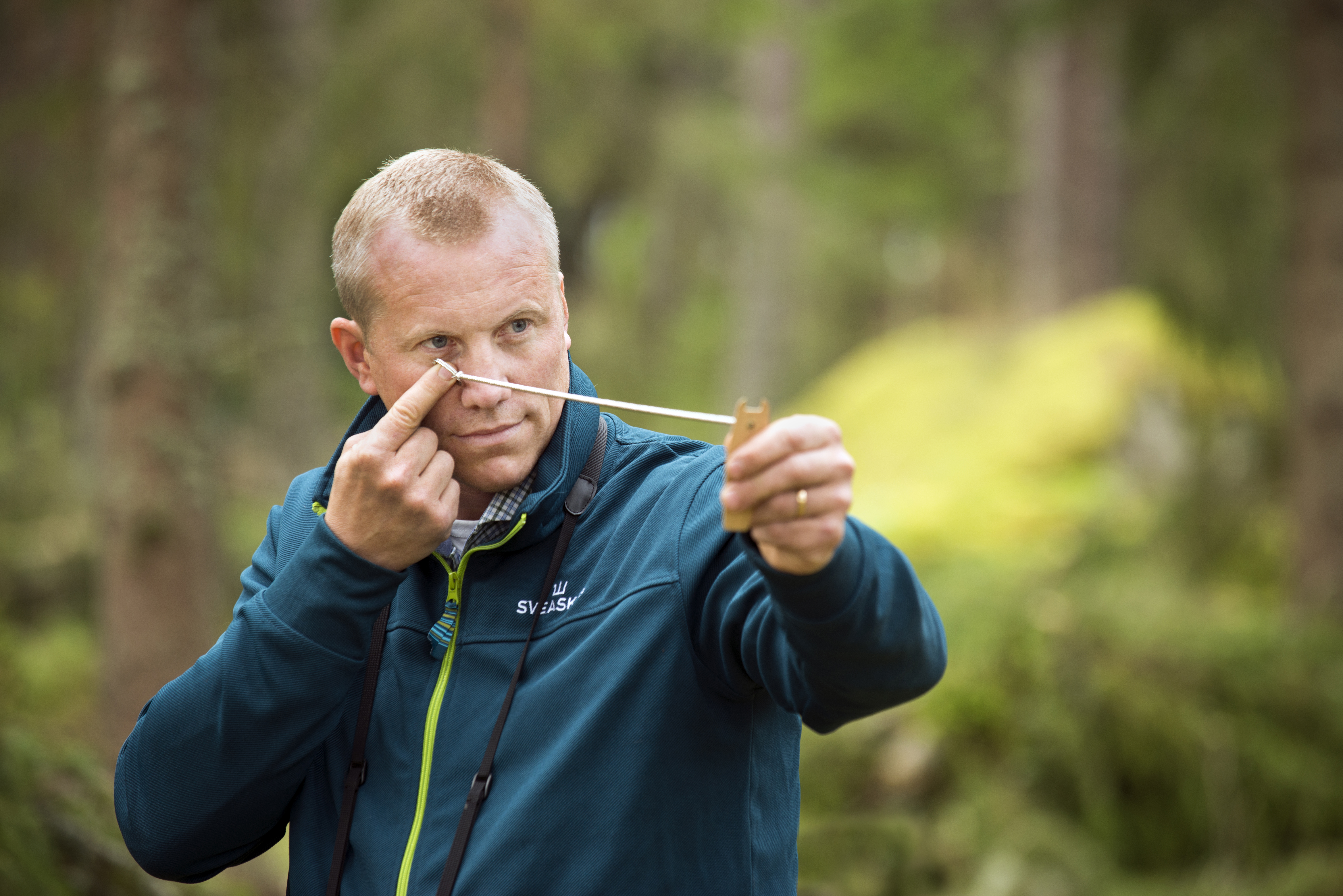 - Beskrivning: Henrik Öhman, virkesköpare, bestämma trädhöjd, höjdmätare, instrument, mätning