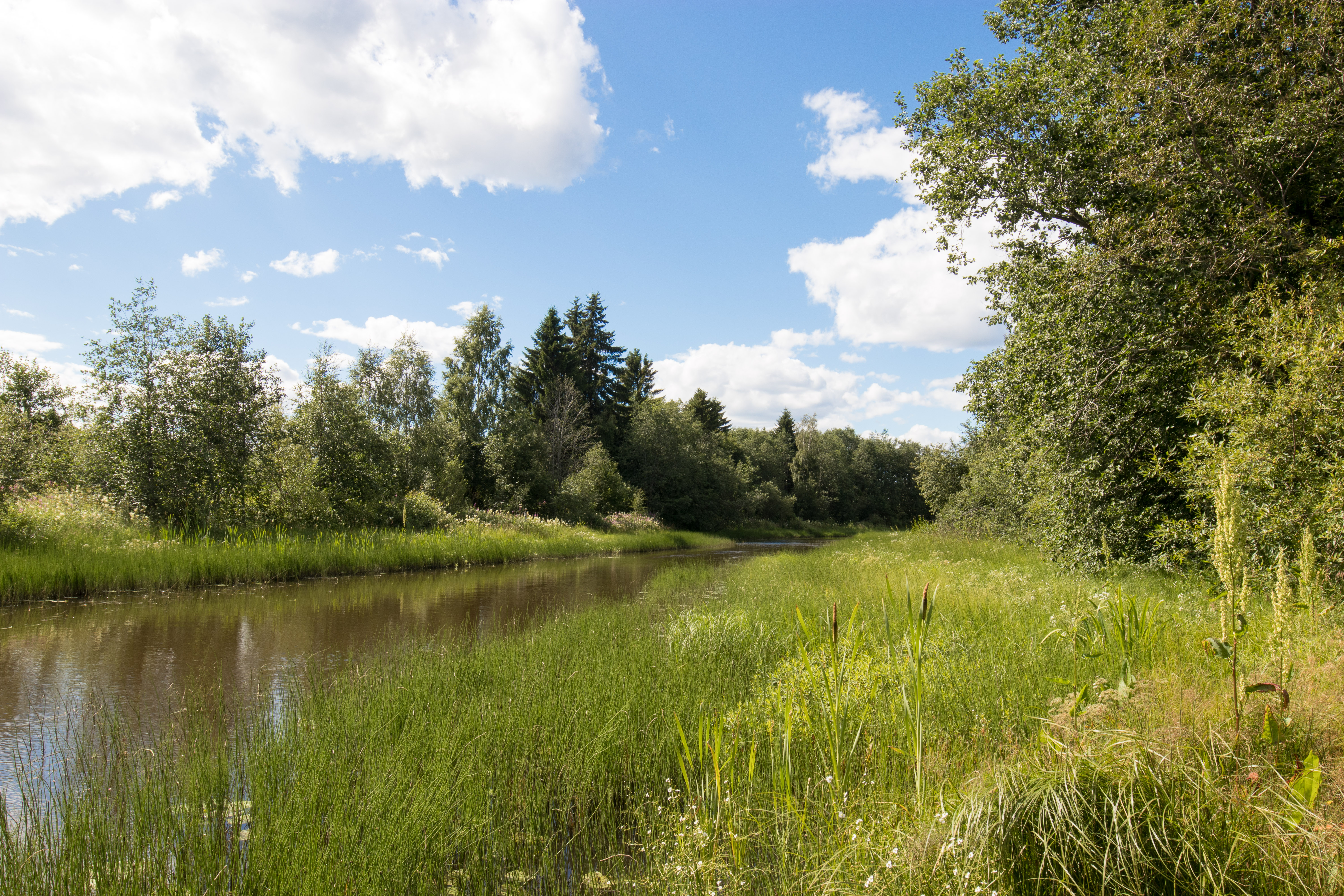 - Beskrivning: Bäck, å, sommarlandskap, våtmark, vass