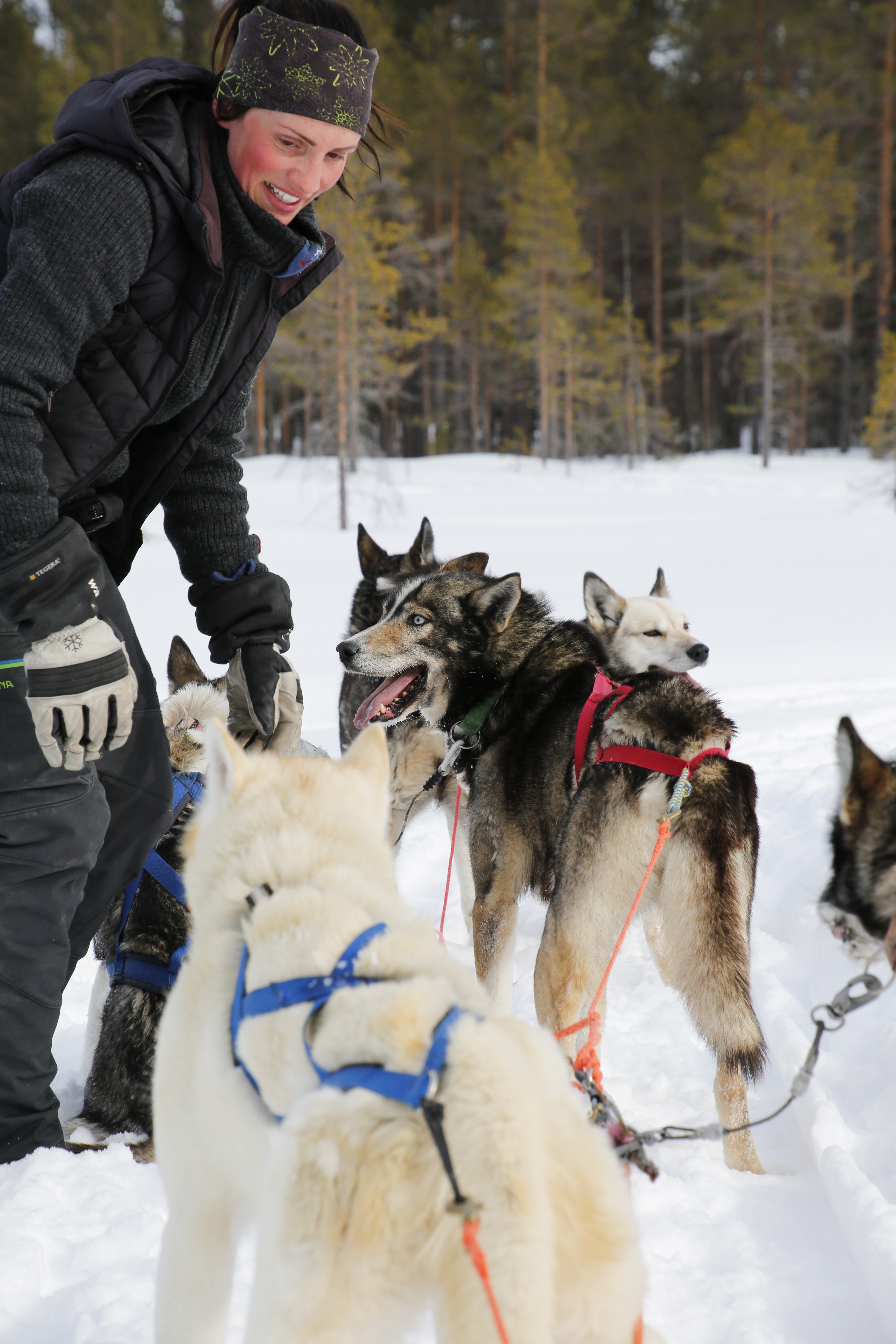 - Beskrivning: Juliane stannar för att rätta till hundarnas selar, Juliane Nicklass driver Spruce Island Husky, hundspannsekipage, naturturismbild, naturturism, hundspann, hundspannsföretag, Juliane Husky Walk , Huskyhun, Granö Bäckasin