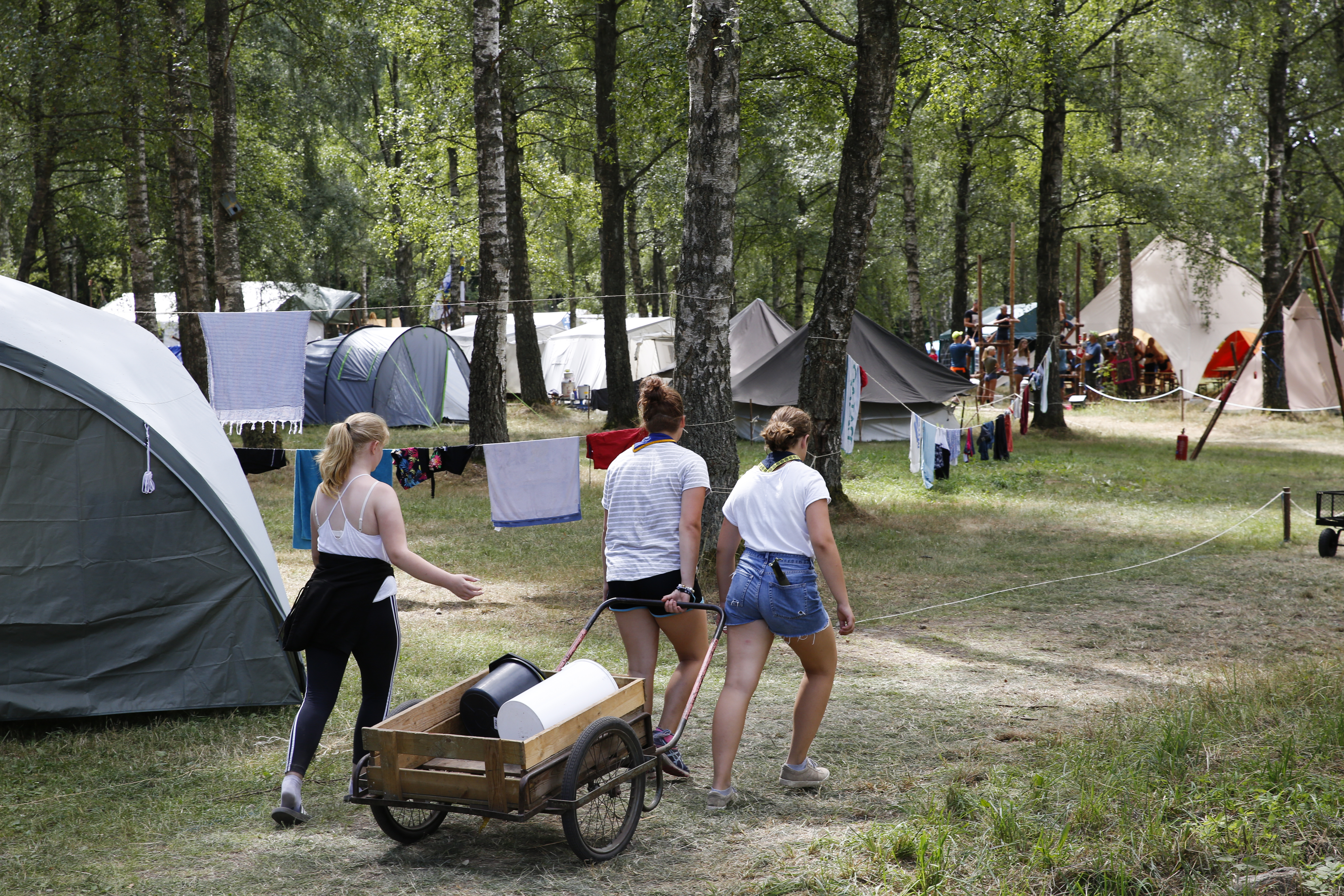 - Beskrivning: Lägerområdet är stort och det krävs vagnar för att transportera slanor, vatten och mat, Scouternas Regionläger i Skåne, Sveaskog + Scouterna = sant