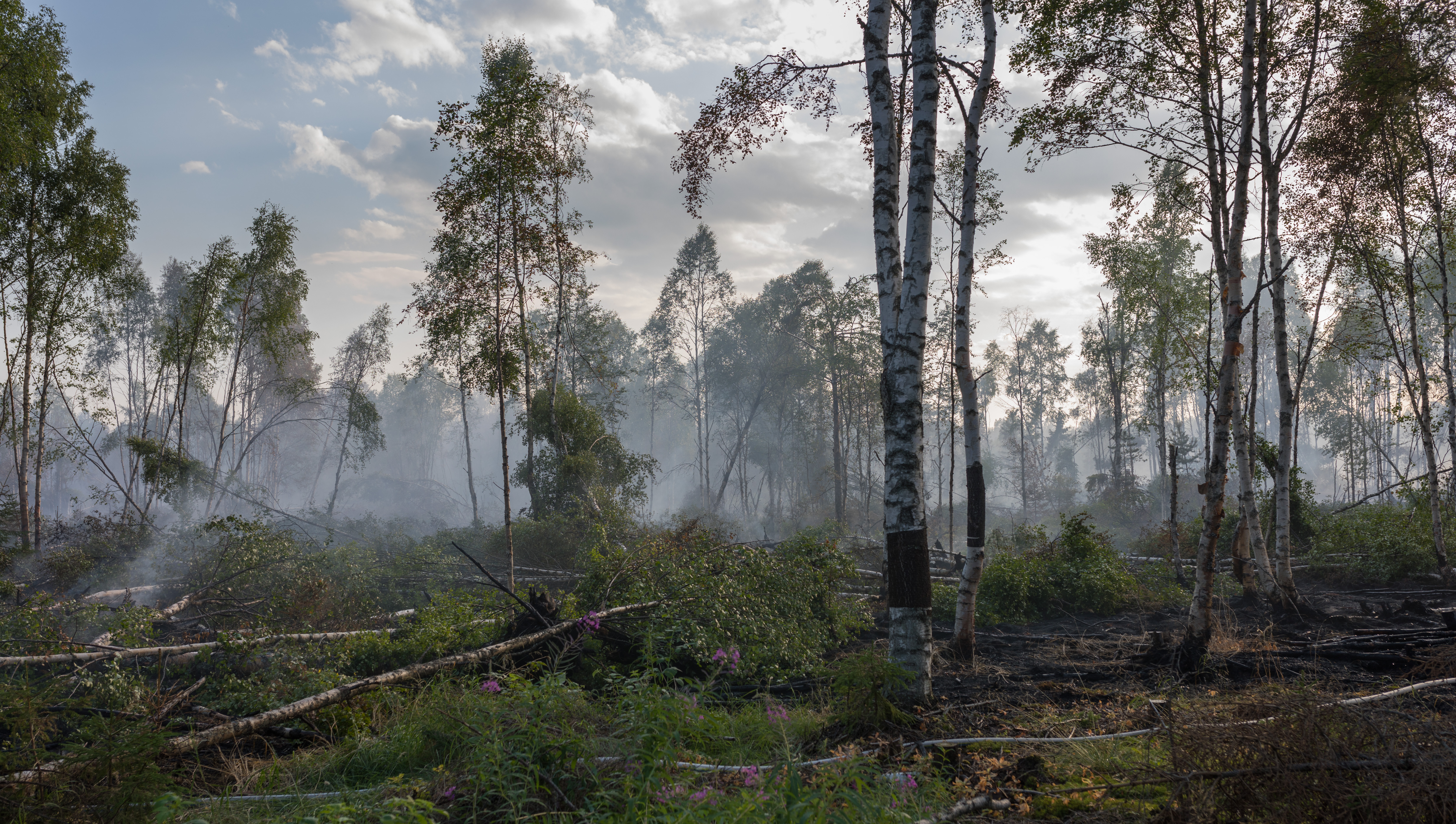 - Beskrivning: Efter skogsbränderna 2018, skogsbrand, efter brand, eftersläckning, rök, nedbränd skog