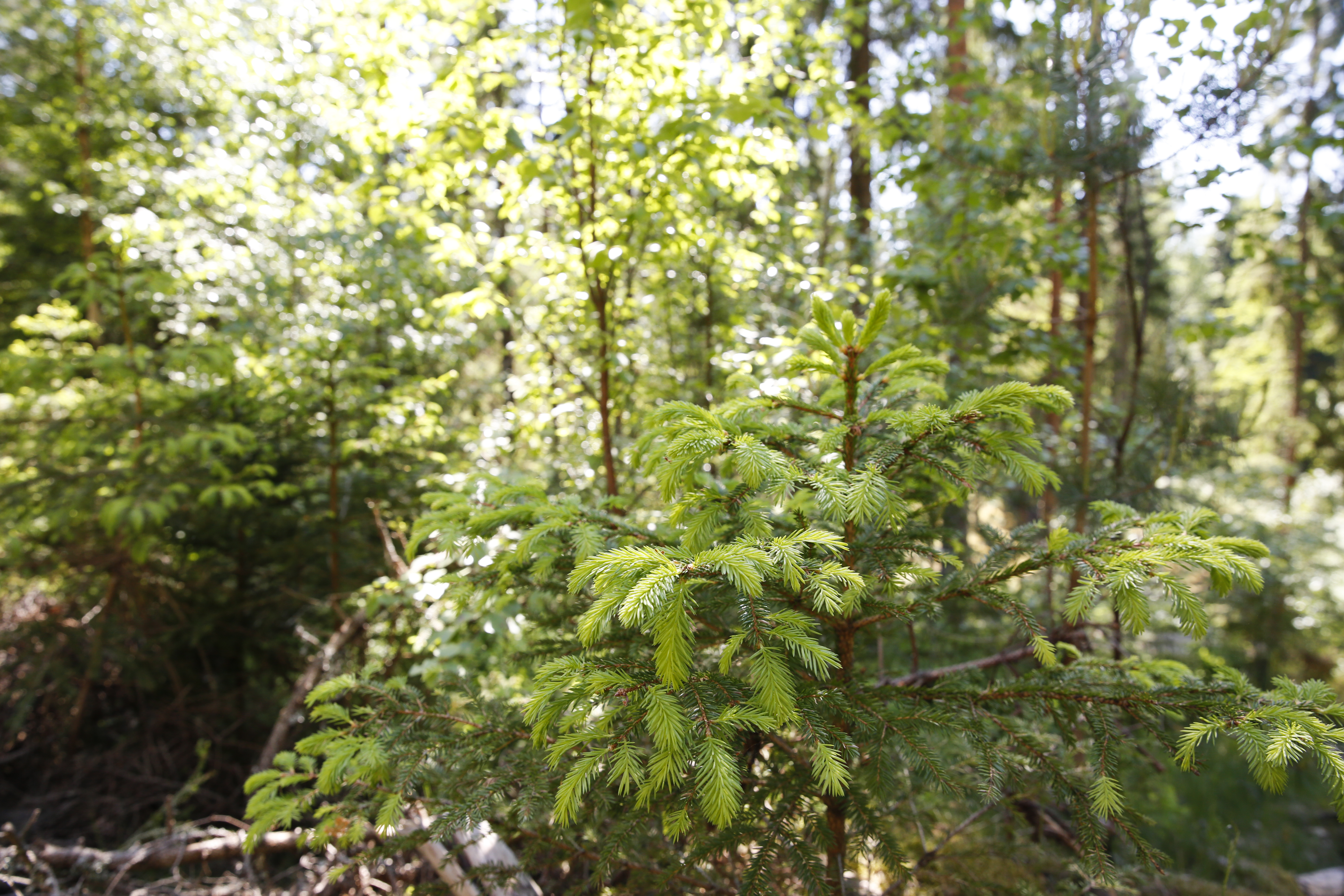 - Beskrivning: I en glänta (14 år gammal efter stormen Gudrun) alldeles bredvid åtgärdsområdet (måldiametershuggning) har självföryngringen satt fart på allvar. Även här har granen fått starkt fäste, Hyggesfritt skogsbruk i praktiken, bild från en artikel med Peter Ask och Gisela Björse om hur hyggesfritt skogsbruk kan fungera i verkligheten.