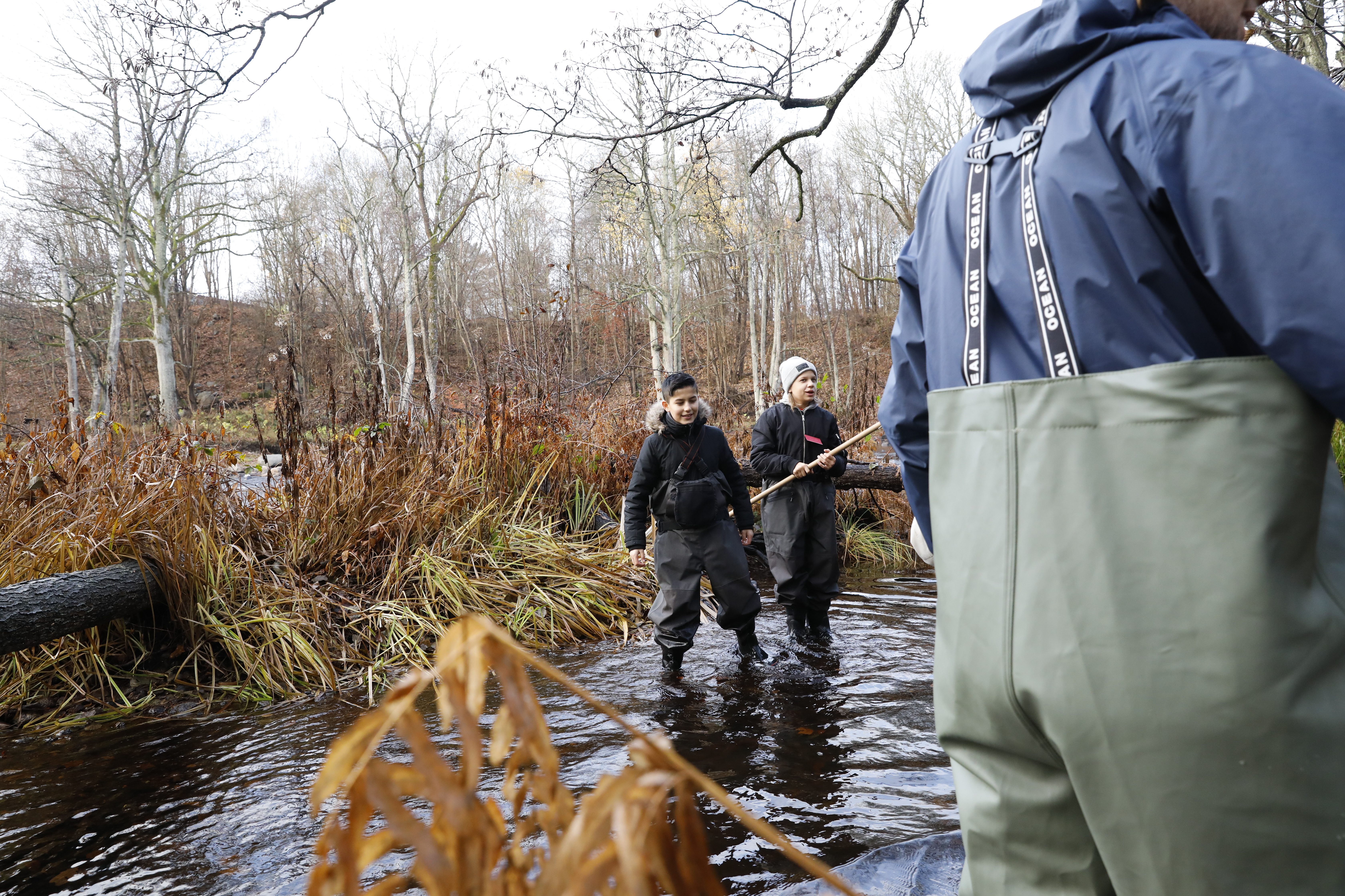 - Beskrivning: Rashad Hafez och Liam Sandberg provar vadarbyxor för första gången.