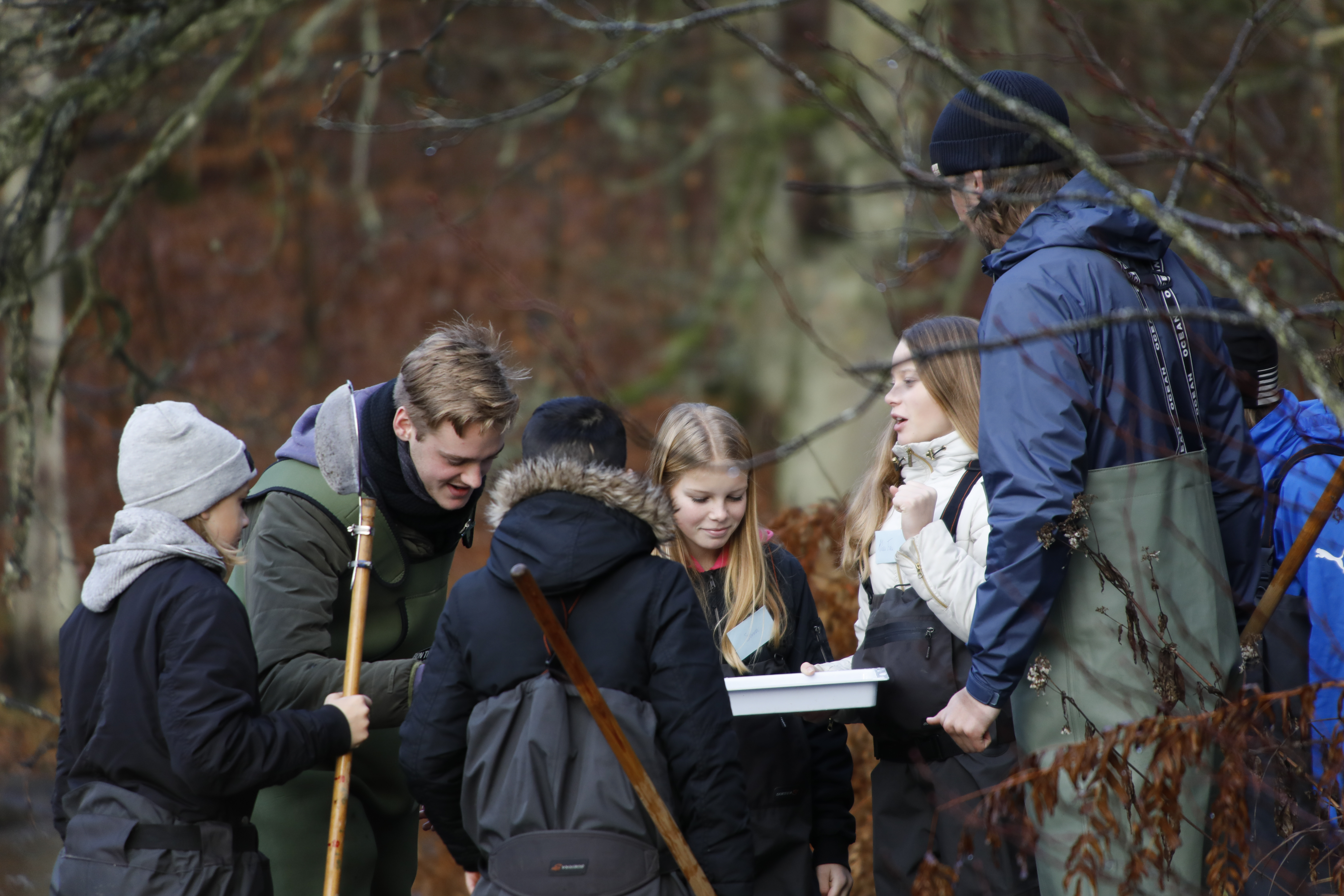 - Beskrivning: Joel Fredriksson hjälper elever att leta vattenlevande insekter under stenar ute i vattendraget.