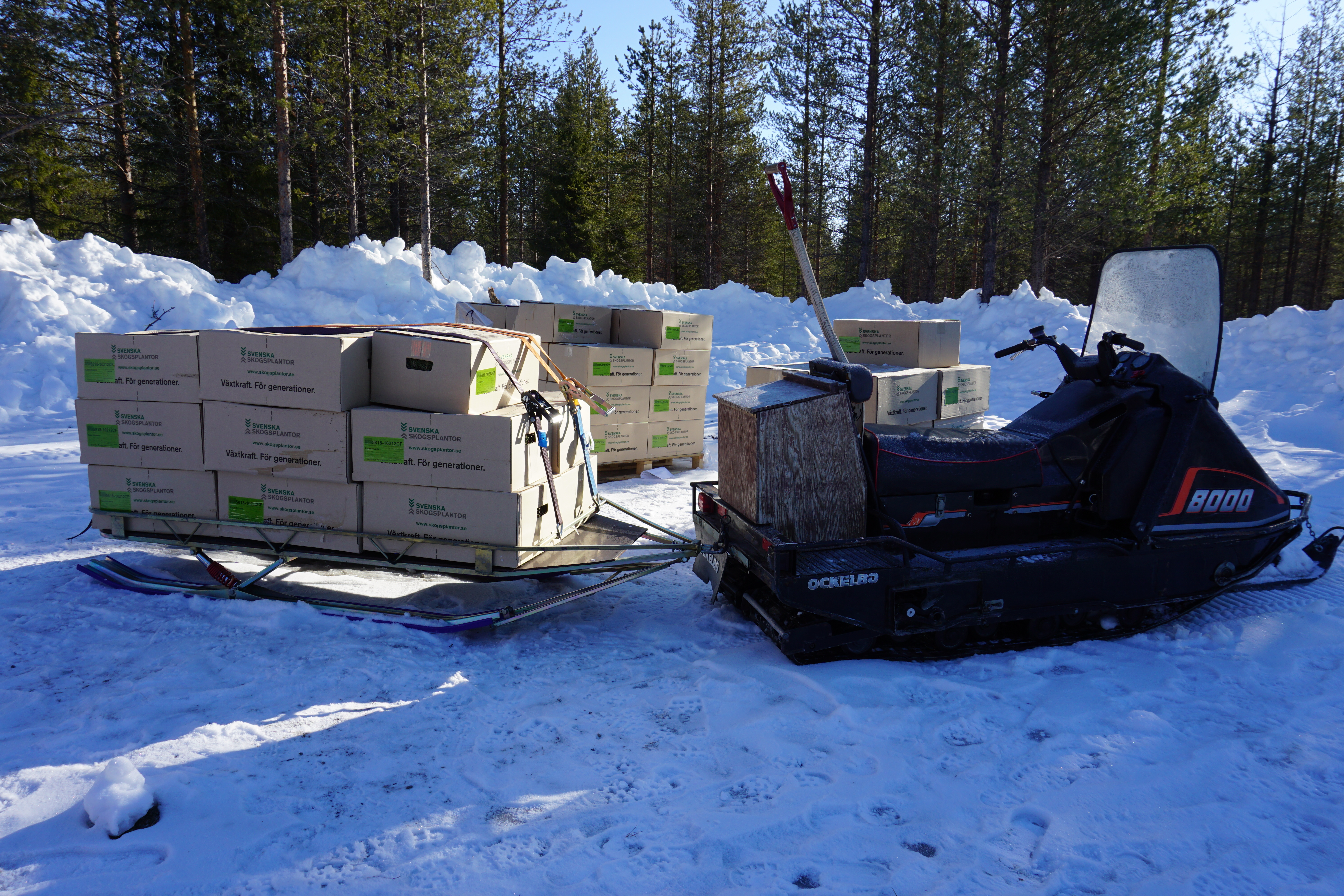 - Beskrivning: Skoterplantor, Plantor som levereras med skoter, Sveaskog anlägger och underhåller mer än 4000 mil skogsväg men det finns områden som inte kan nås direkt med bil. Det gäller till exempel myrmarksområden eller öar där framkomligheten av naturliga skäl är begränsad. Det ger i sin tur utmaningar för skogsvårdsentreprenörerna som ska föryngra och plantera på de otillgängliga markerna.