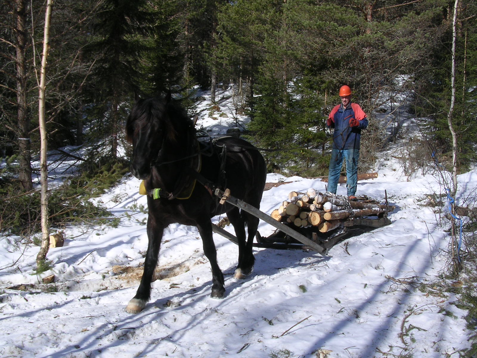 - Beskrivning: Avverkning pågår i Ekopark Hornslandet, hästförare Kjell Larsson kör ett timmerlass.