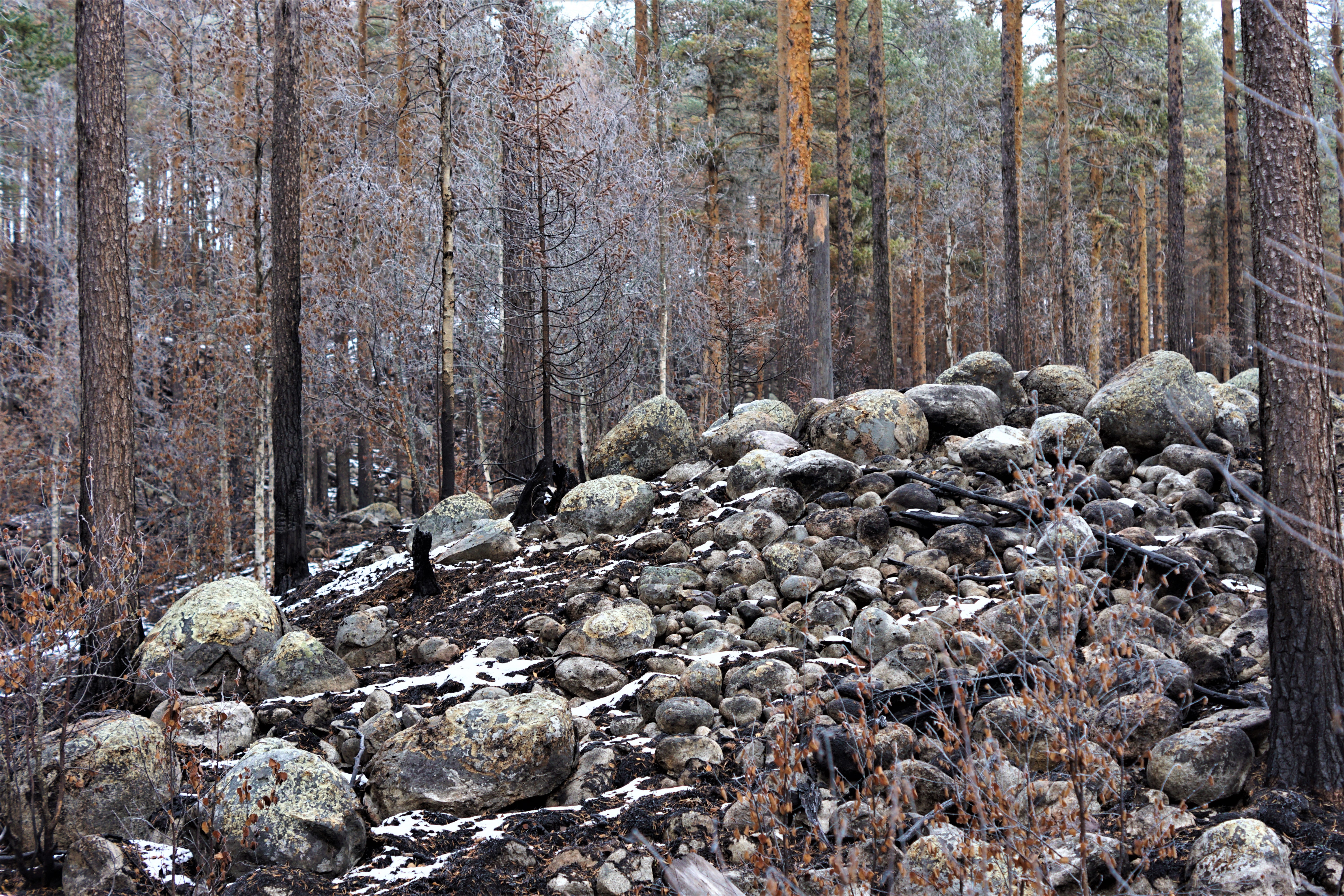 • Beskrivning: Naturvårdsbränning i Ekopark Käringberget, träd, kala träd, brand, ekopark, stenar, rullstensås
