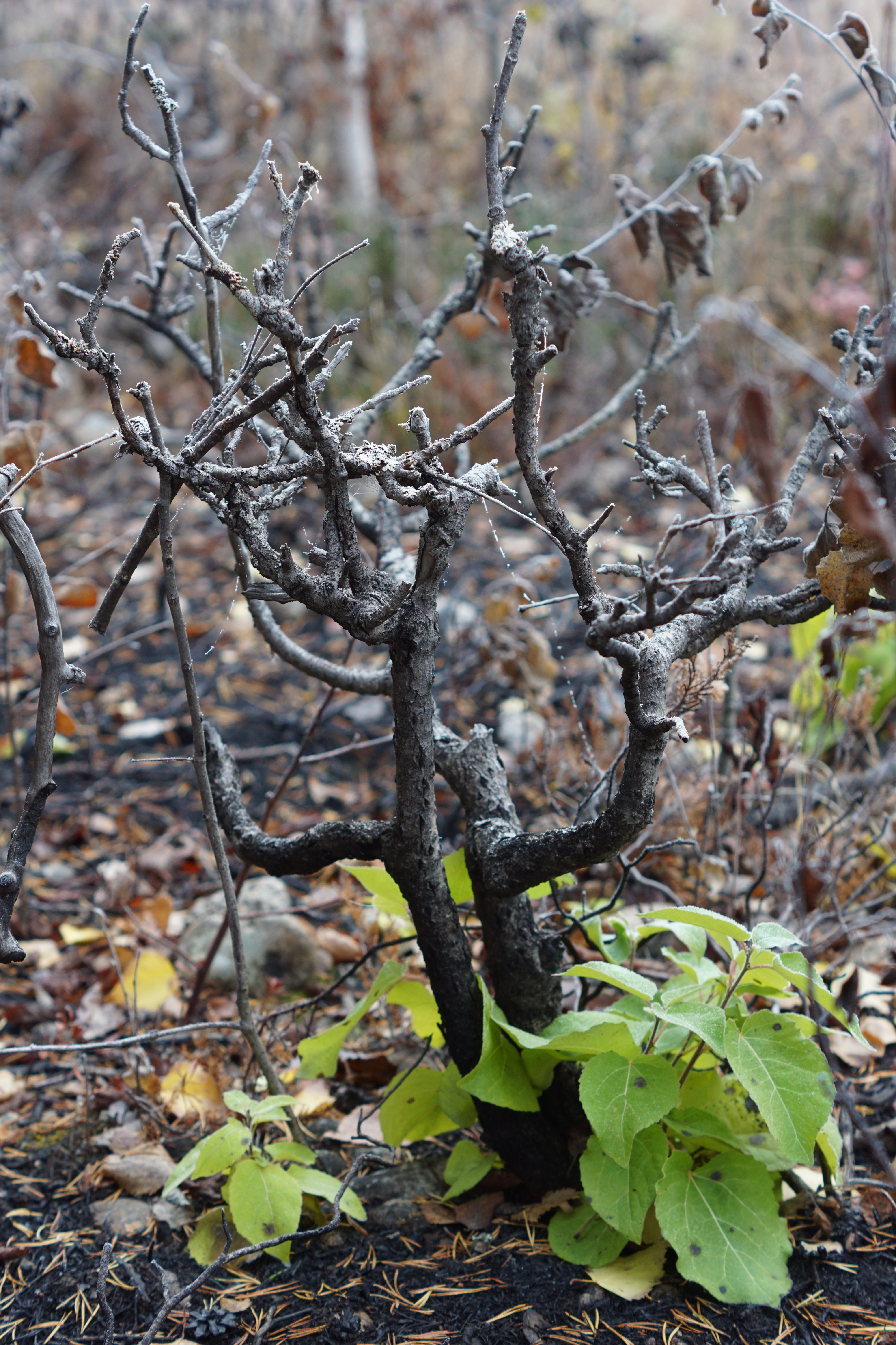 - Beskrivning: Naturvårdsbränning i Ekopark Käringberget, rotskott, brand, löv, gröna löv