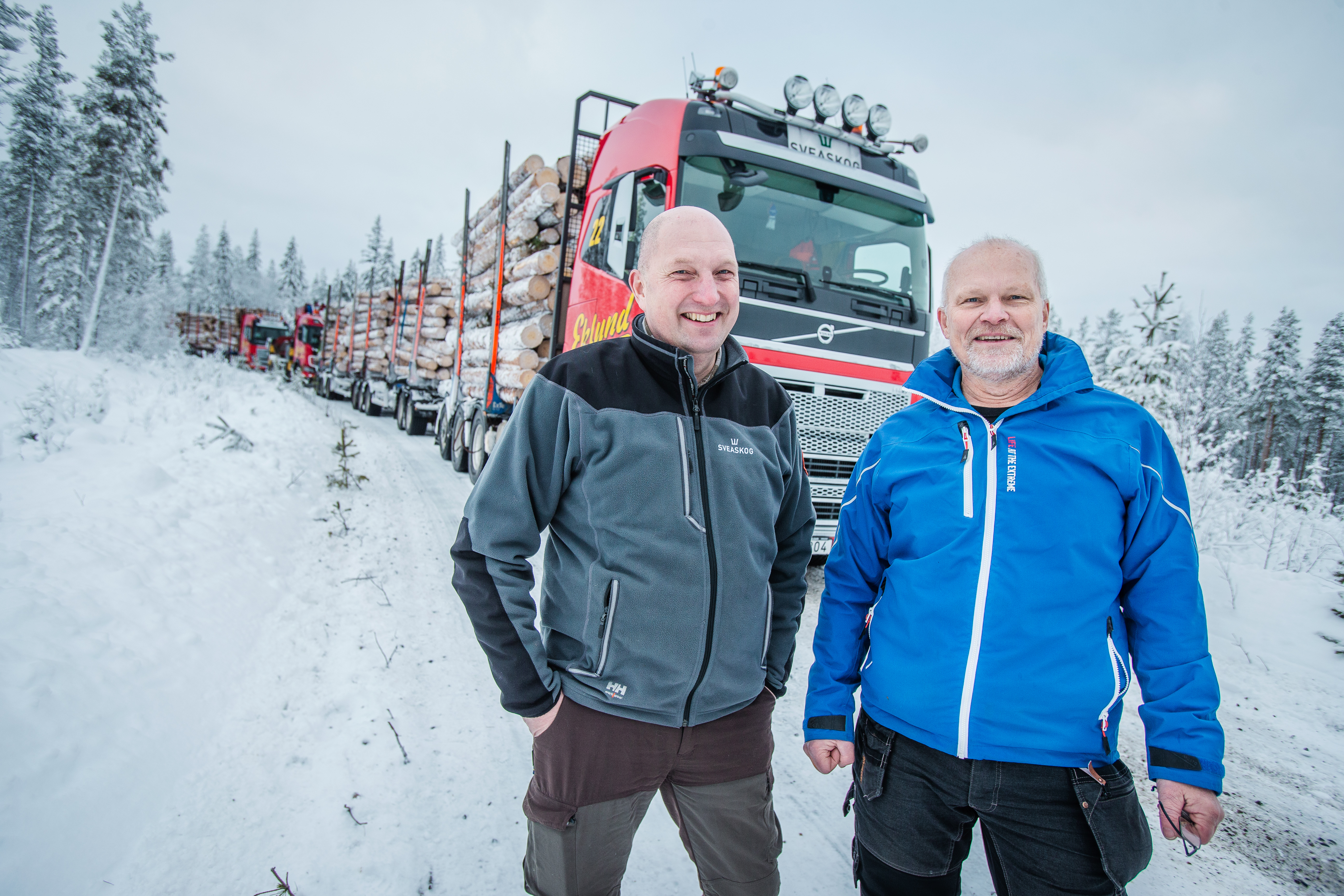- Beskrivning: Konfigurationstester av HCT-ekipage – tunga och långa fordon – i Vidsel, mellan Älvsbyn och Jokkmokk i Norrbotten. Henrik Engman tillsammans med Lennart Cider, projektledare Volvo Lastvagnar. Logistik, transport, timmerbil, tunga fordon, 90 ton
