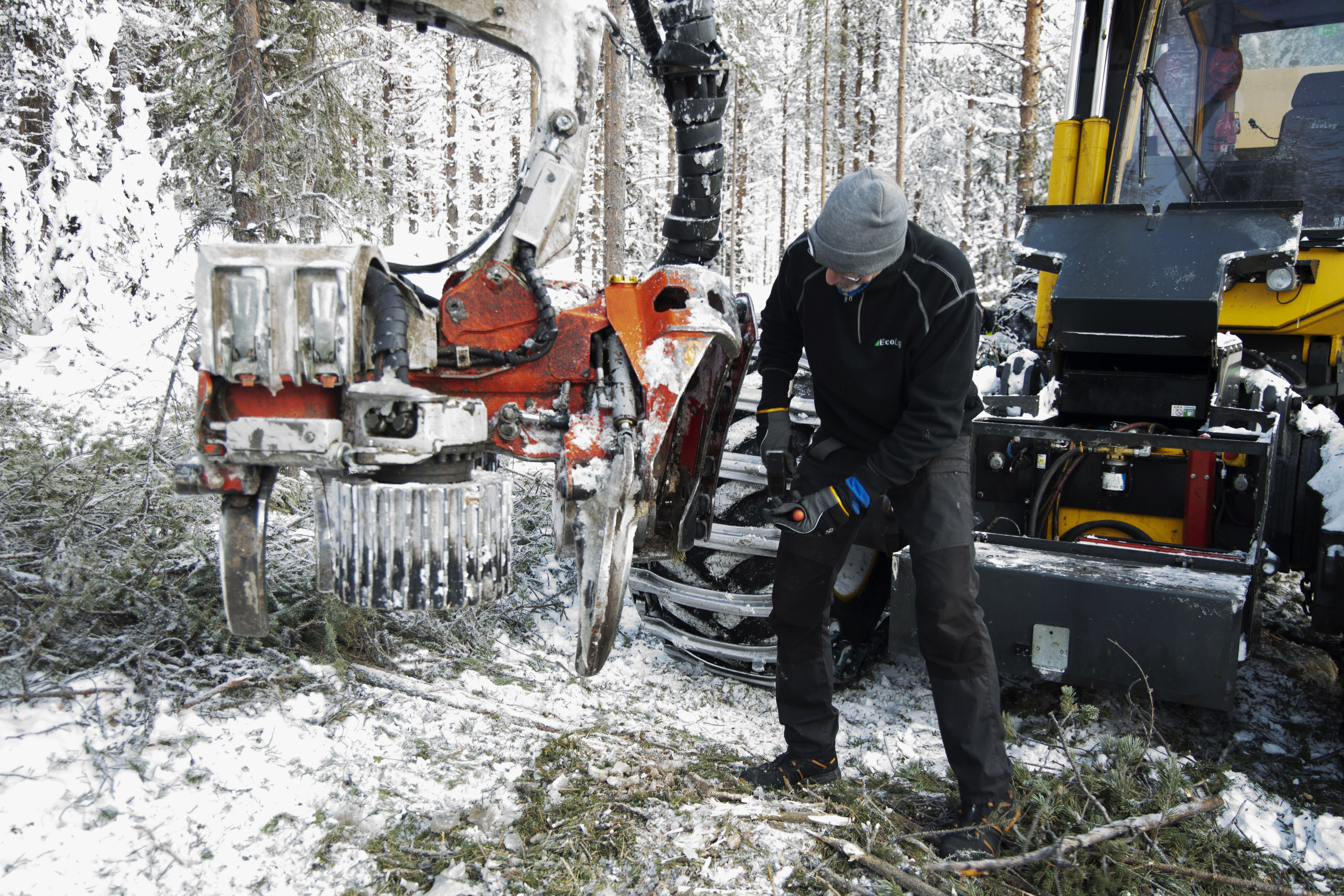 - Beskrivning: Lag från Syd till Nord, närbild på aggregatet. Det rasar snö varje gång skördaren fäller ett träd, och eftersom aggregatet är varmt smälter den vilket leder till isbeläggningar som föraren måste ut och knacka bort.