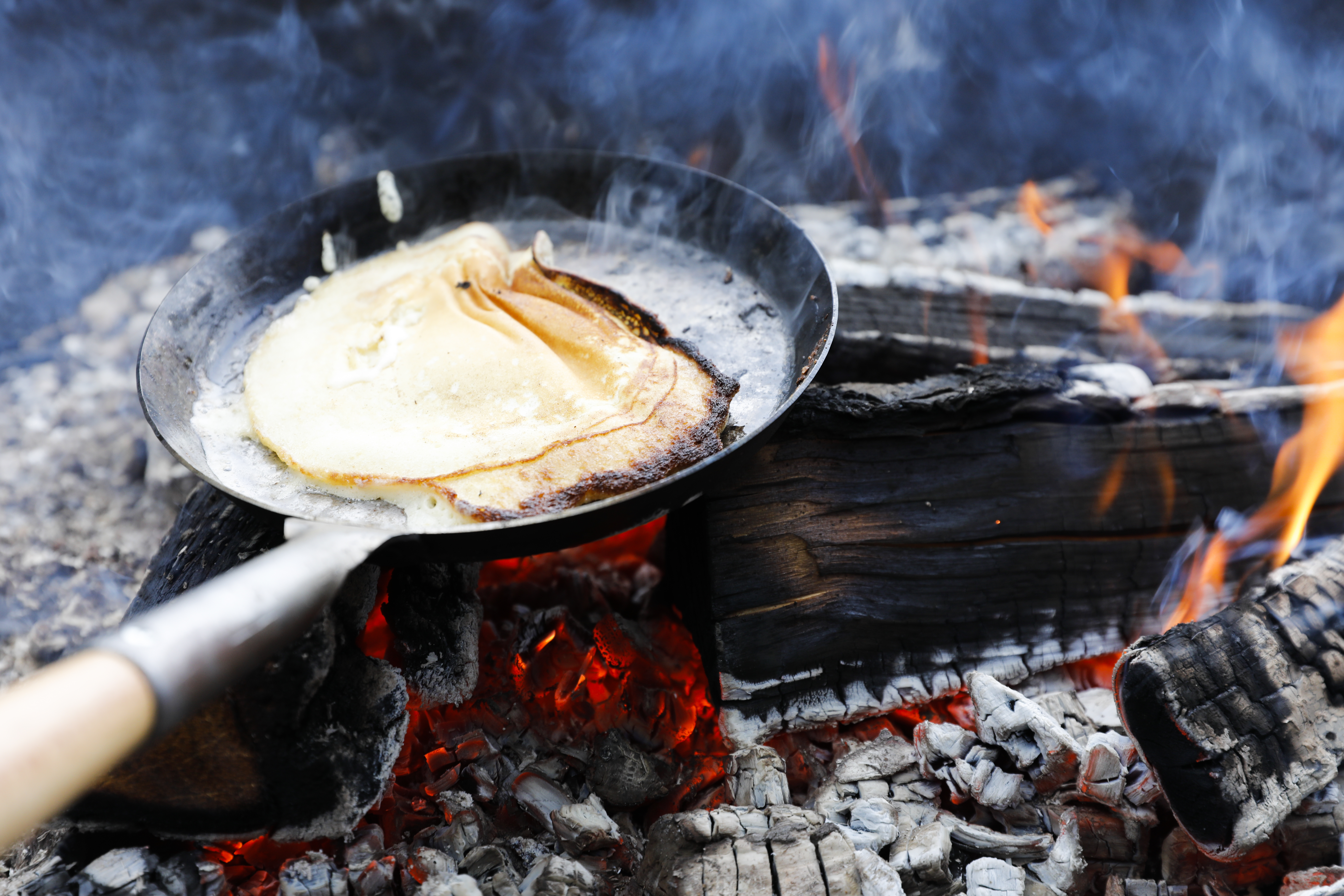 - Beskrivning: Ekopark Raslången, eld, matlagning, mat, stekpanna, glöd, rök, ved