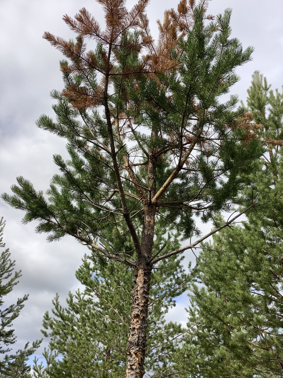 • Beskrivning: Törskate, törskateangrepp, svampskador, tall tallungskog, bruna grenar, grön topp, barr