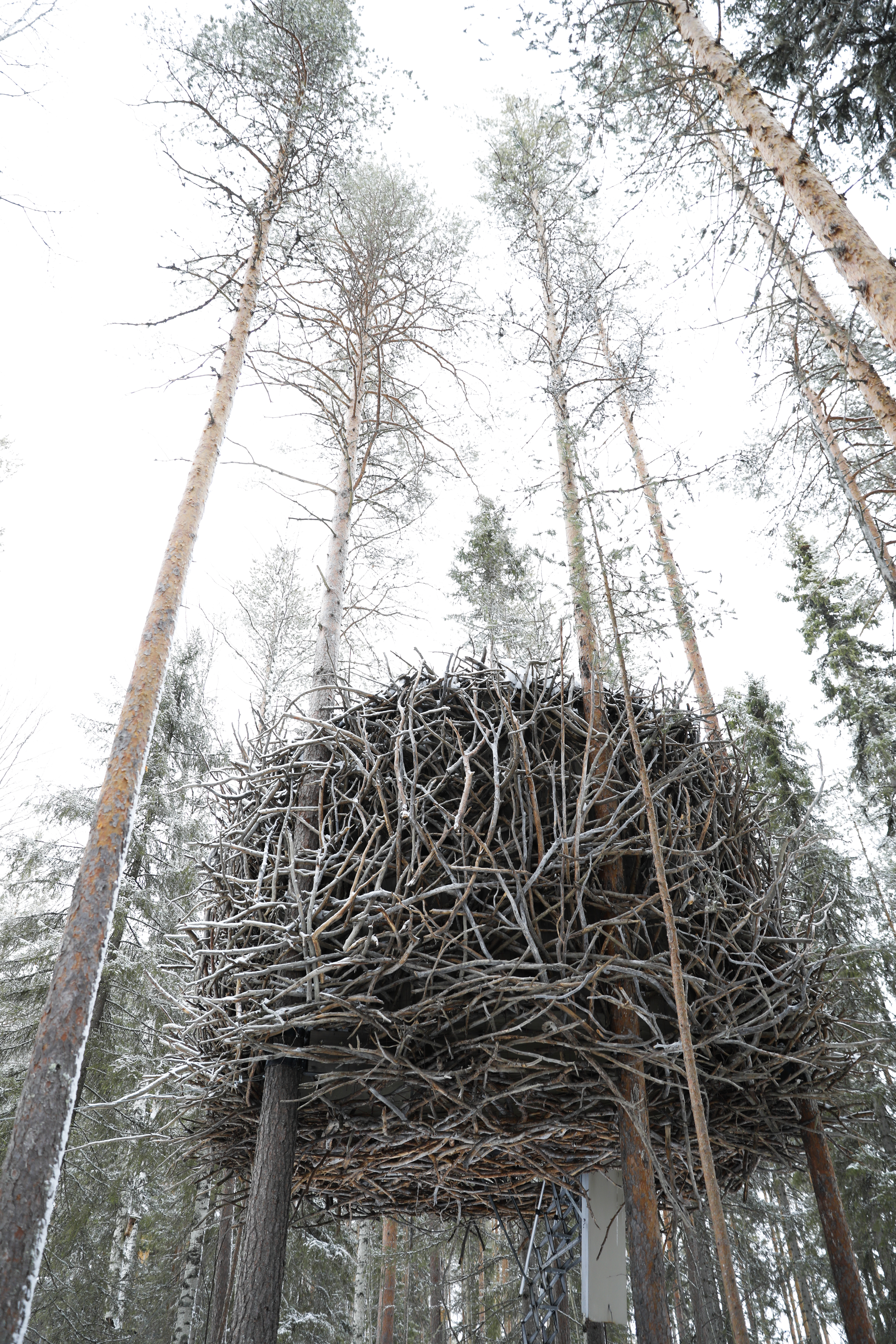 • Beskrivning: Fågelboet Birds Nest är ett enormt fågelbo i en imponerande pinnkonstruktion, hotell, hotell i träd, trädhotell, rum, träd, pinnar, på Sveaskogs marker