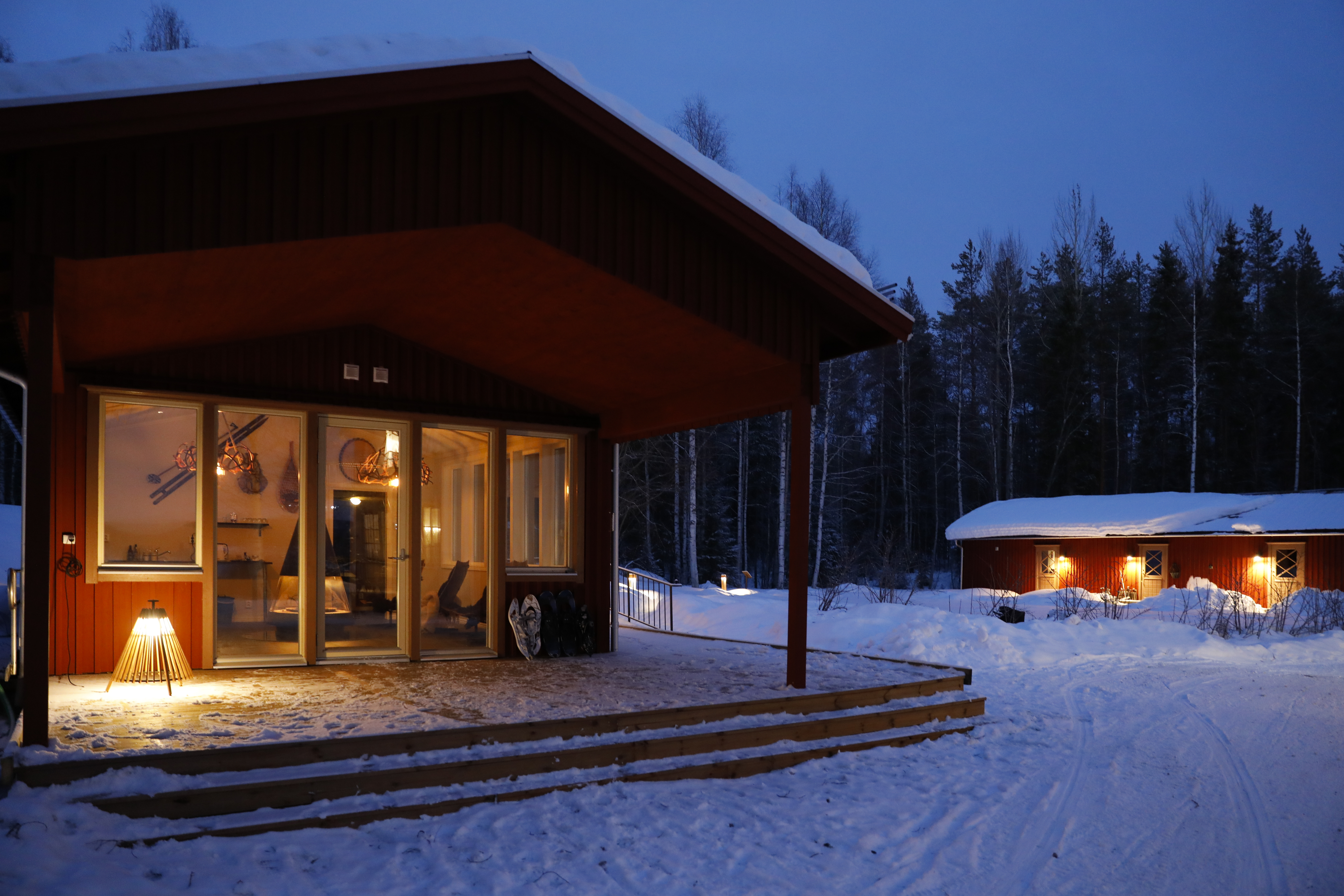 - Beskrivning: I loungen, runt den brinnande elden, checkar gästerna in och möter sina guider inför stundande äventyr, stuga, snö, på Sveaskogs marker