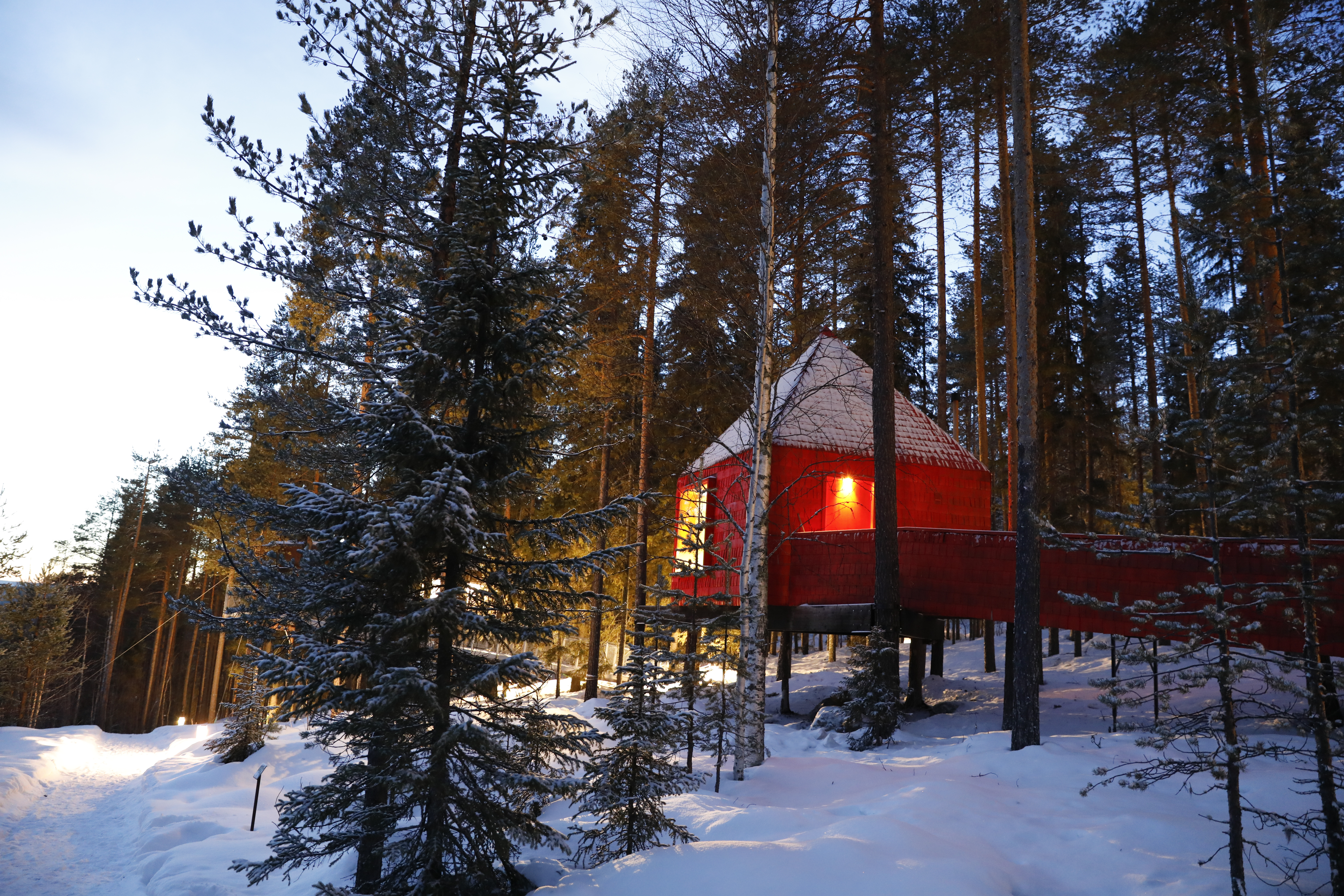 - Beskrivning: The Blue Cone ligger alldeles i skogsbrynet och ger en magisk utsikt över skogslandskapet, röd stuga, snö, träd, hotell, hotell i träd, trädhotell, rum, på Sveaskogs marker