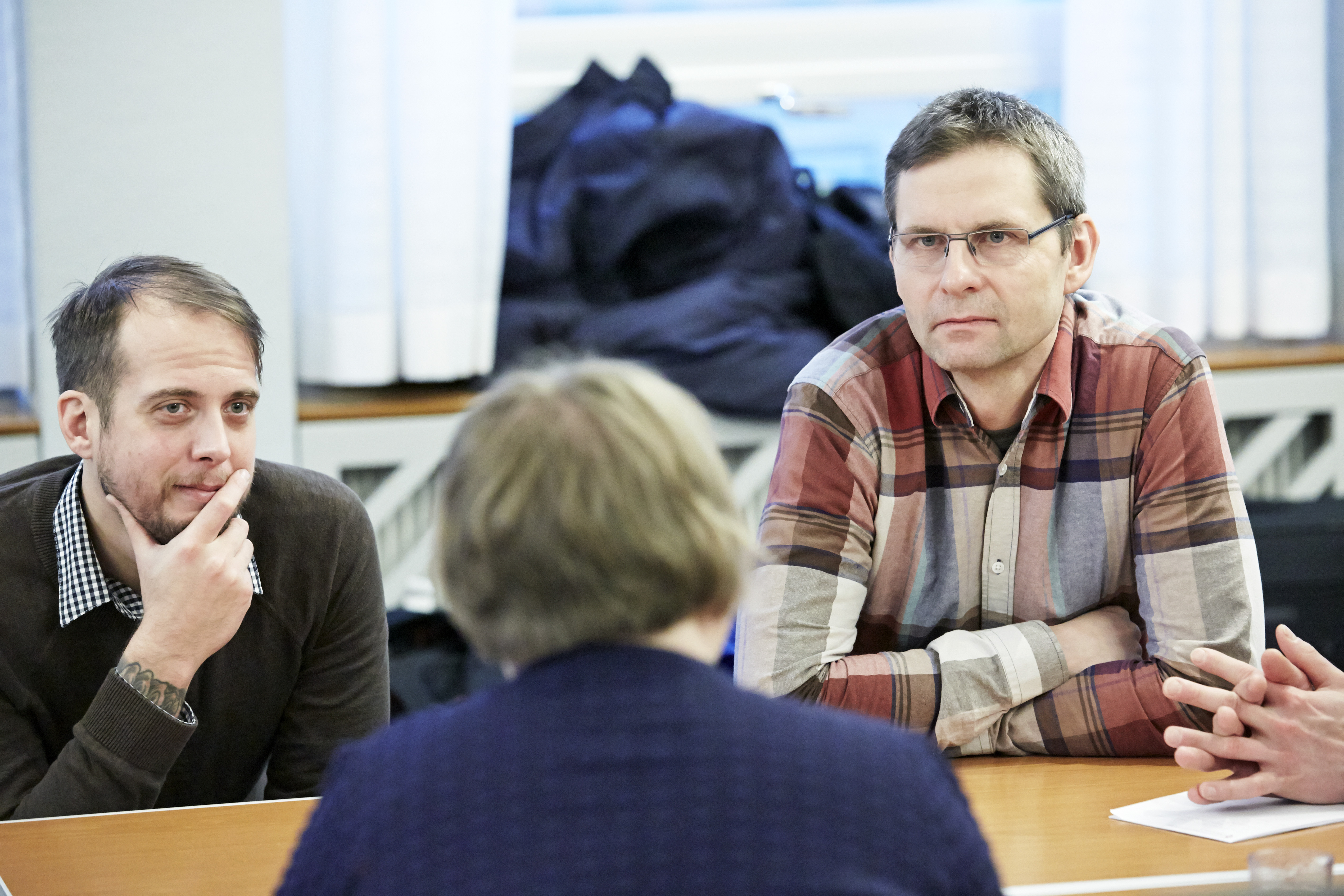 - Beskrivning: En gång om året bjuder Sveaskog in alla nyanställda till introduktionsdagar i Stockholm, Per Söderberg och Martin Falkeström, områdesansvariga, i samtal med Anna-Maria Rautio, jakt- och klövviltansvarig, gruppsamtal, samtal, diskussion