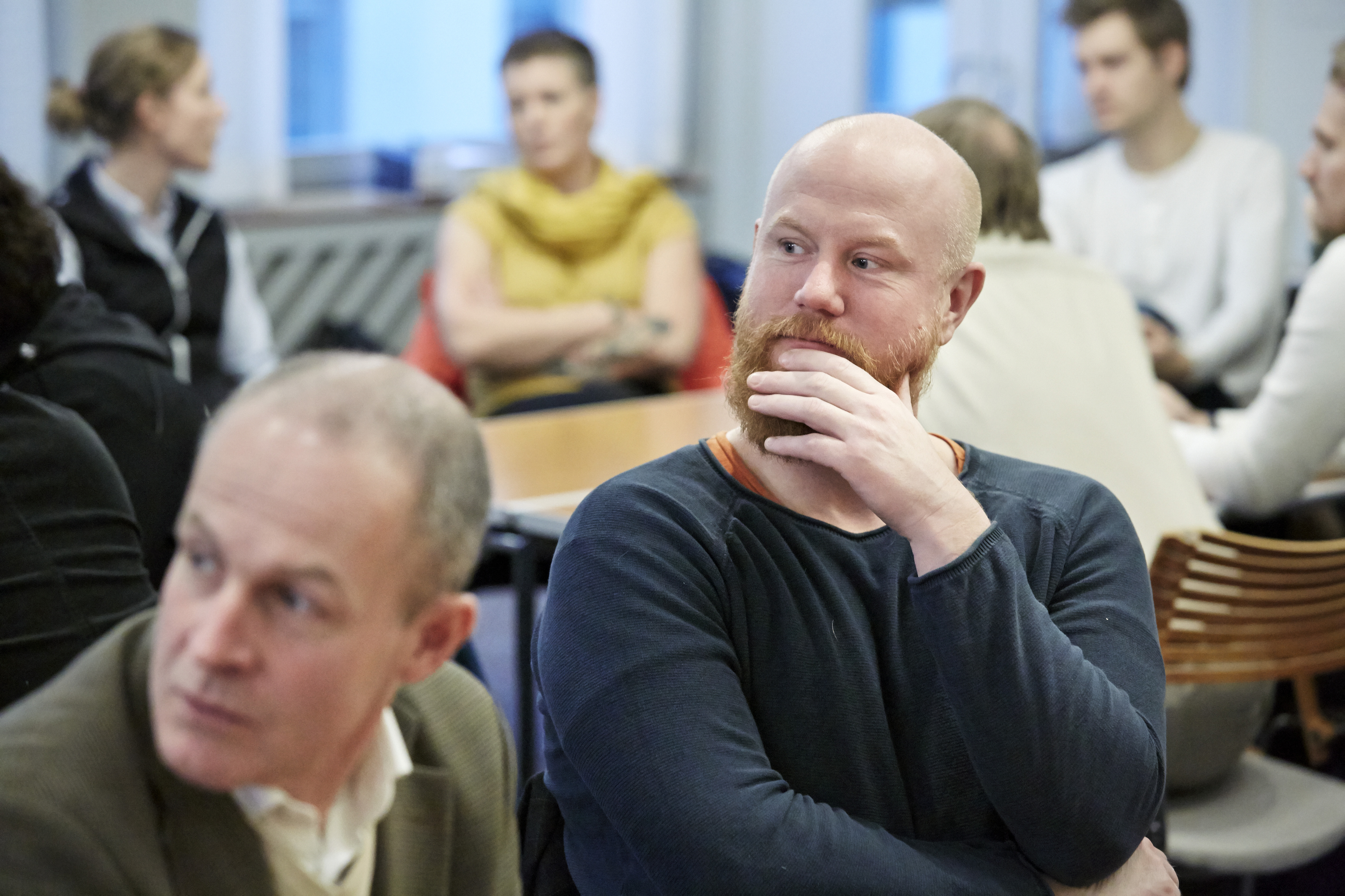 - Beskrivning: En gång om året bjuder Sveaskog in alla nyanställda till introduktionsdagar i Stockholm, Henrik Colliander, inköpare, Marcus Helletun, resultatområdeschef/SSP, lyssnar