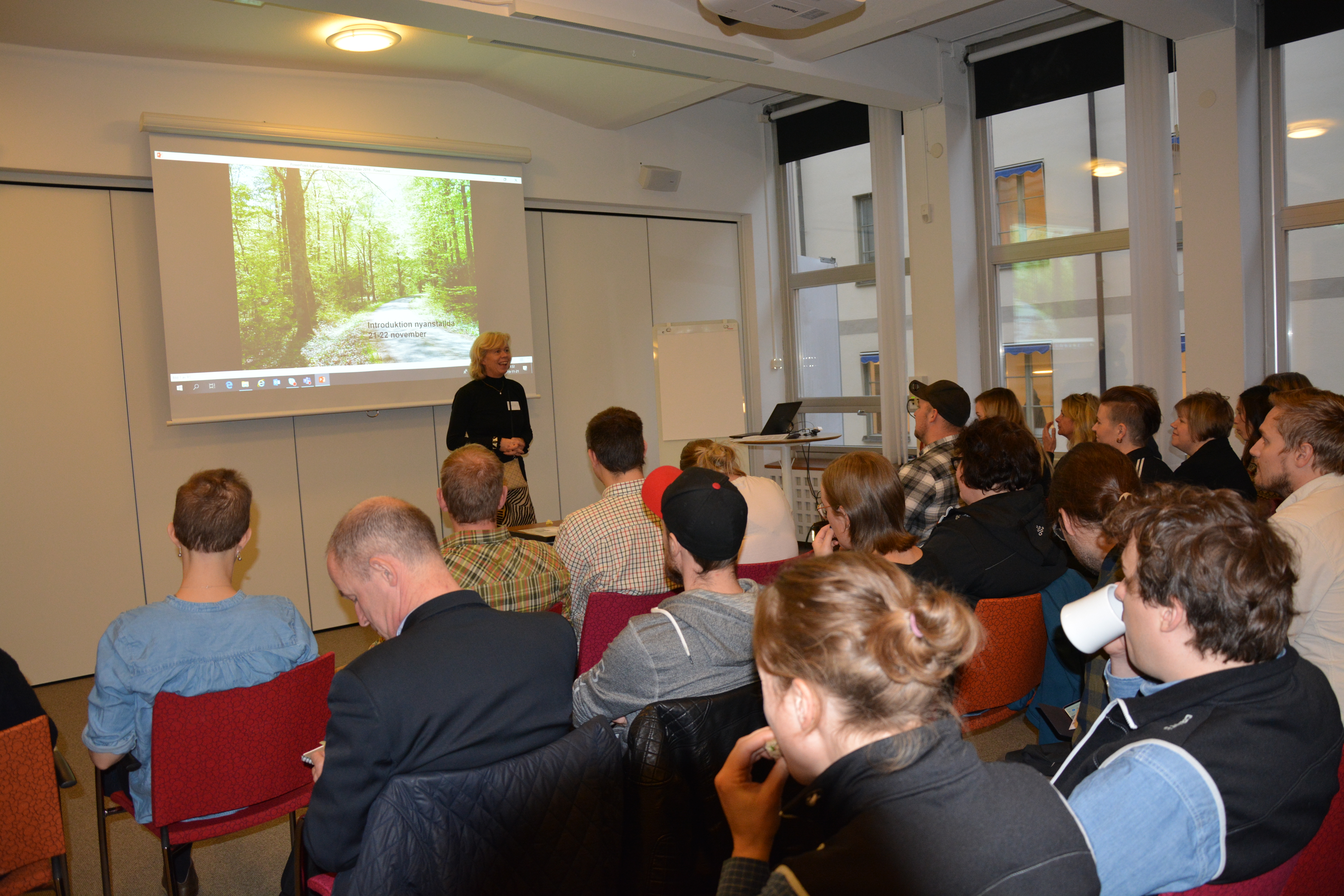 • Beskrivning: En gång om året bjuder Sveaskog in alla nyanställda till introduktionsdagar i Stockholm, Charlotte Jönsson, HR partner, föredrag, pratar, presentation, medarbetare lyssnar, intresse