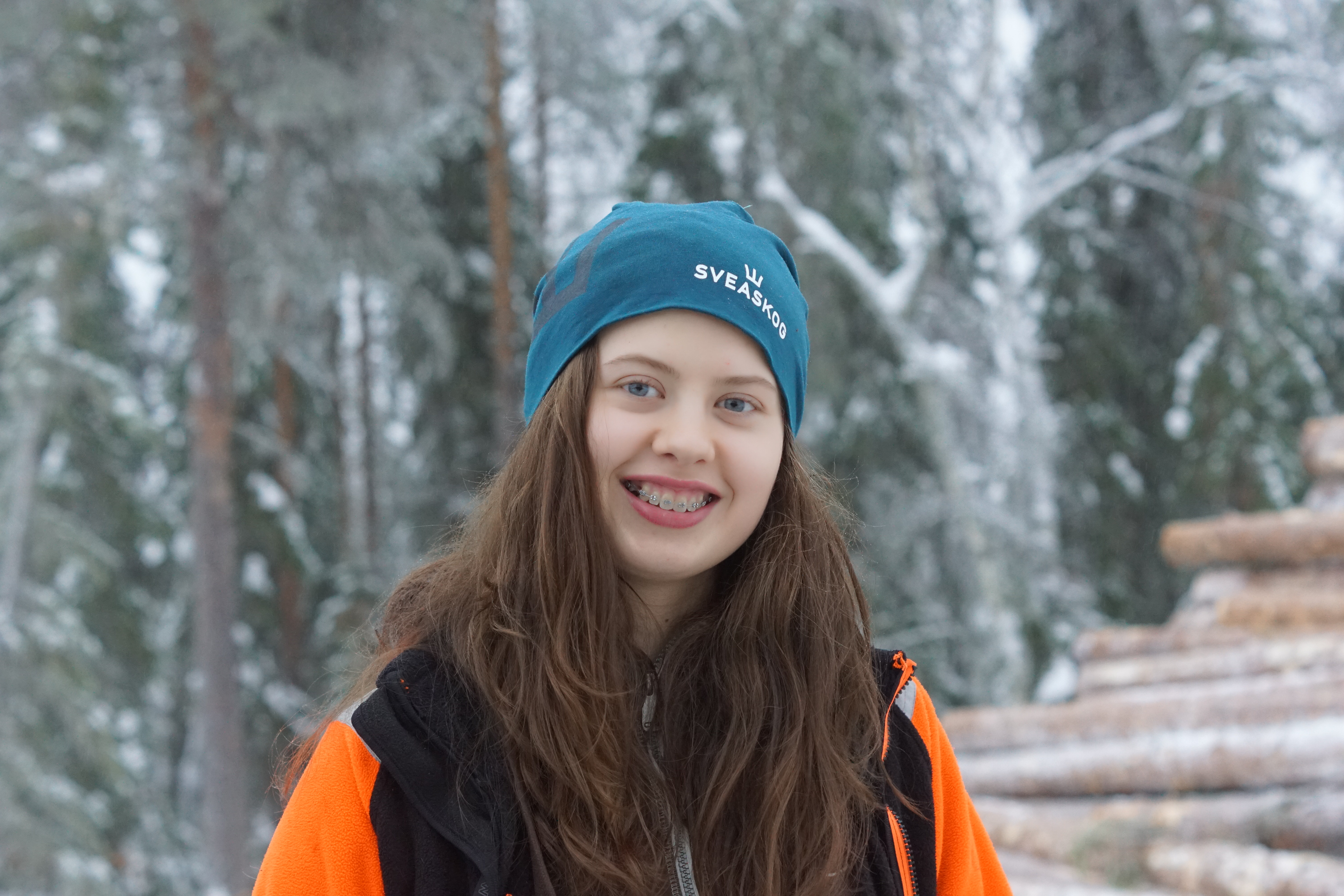 - Beskrivning: Maskinförare Tove Olai MO Nord, Från Nord- till syd står Sveaskog och väntar på att unga utbildar sig för att arbeta i framtidsnäringen, skogsbruk, porträtt, logotyp, profilkläder, arbetskläder, glad, snö
